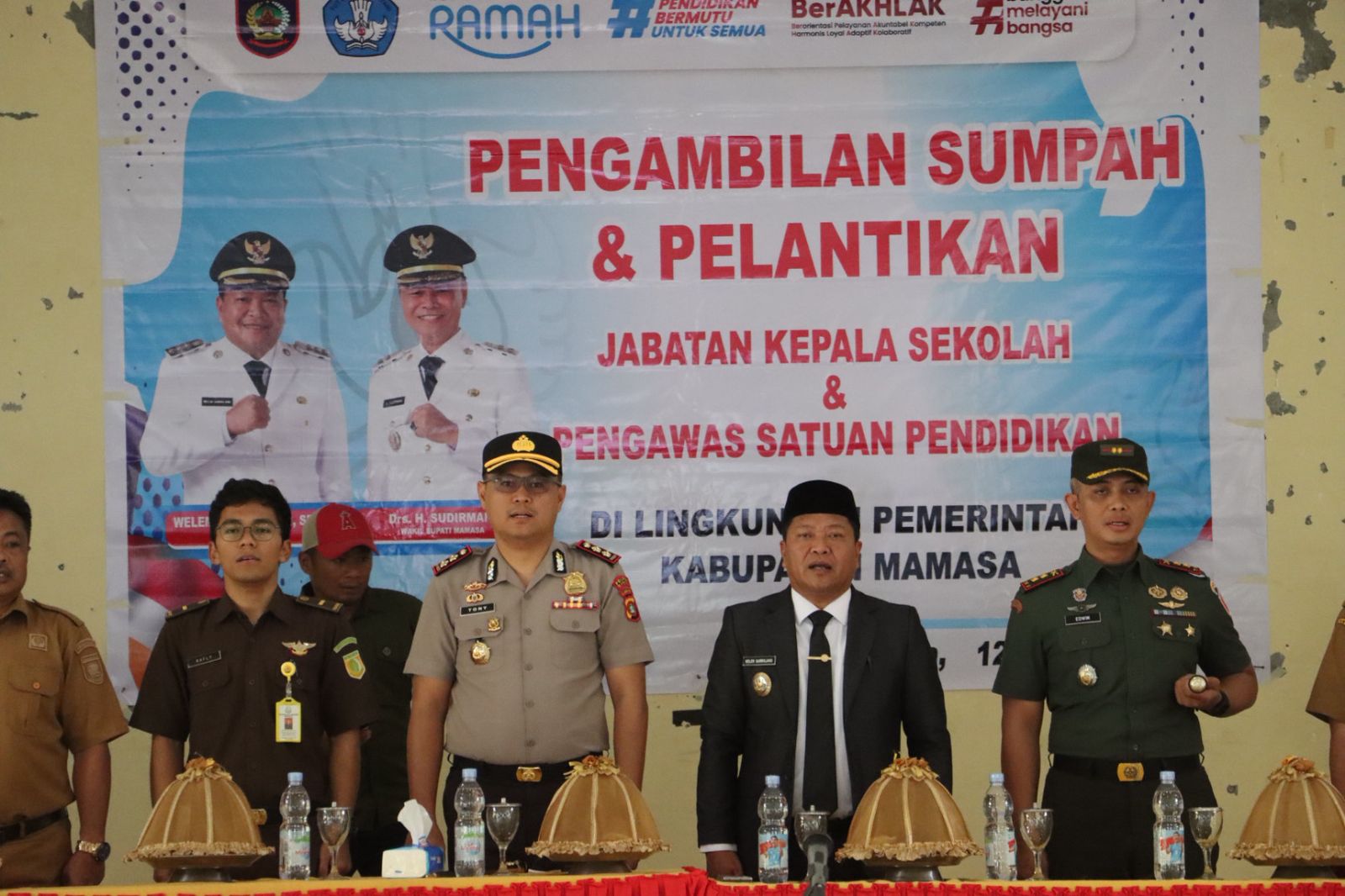 Acara ini dipimpin langsung oleh Bupati Mamasa, Welem Sambolangi, S.E., M.M., dan dihadiri oleh unsur Forum Koordinasi Pimpinan Daerah (Forkopimda) serta pejabat terkait. Turut hadir dalam kegiatan tersebut Dandim 1428/Mamasa Letkol Arh Edwin Hermawan, S.H., M.A.P., perwakilan Kejaksaan Negeri Kabupaten Mamasa Rafly Aulia Hadi, S.H., Kepala BKPP Kabupaten Mamasa Baso Parjuni Amri, S.STP., M.M., serta PLT Kepala Dinas Pendidikan Kabupaten Mamasa, Yohanis.