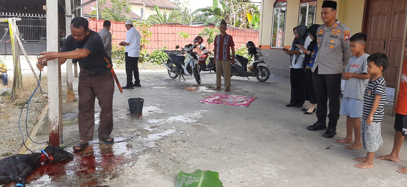 Sekaligus ikut penyembelihan hewan kurban, dalam rangka memperingati hari Idul Adha.