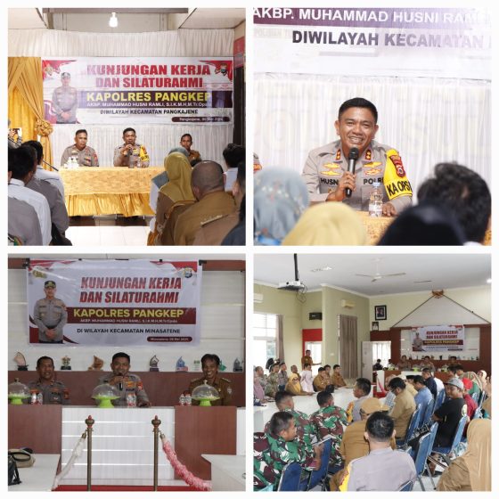 Pangkep – Kapolres Pangkep AKBP Muhammad Husni Ramli, S.I.K., M.H., M.Tr.Opsla, melaksanakan kunjungan kerja dan silaturahmi ke wilayah Kecamatan Pangkajene dan Kecamatan Minasatene pada Senin, 5 Mei 2025. Kegiatan ini bertujuan untuk mempererat hubungan antara Polres Pangkep dengan jajaran Polsek, unsur Muspika, serta tokoh masyarakat, agama, dan pemuda di masing-masing kecamatan.