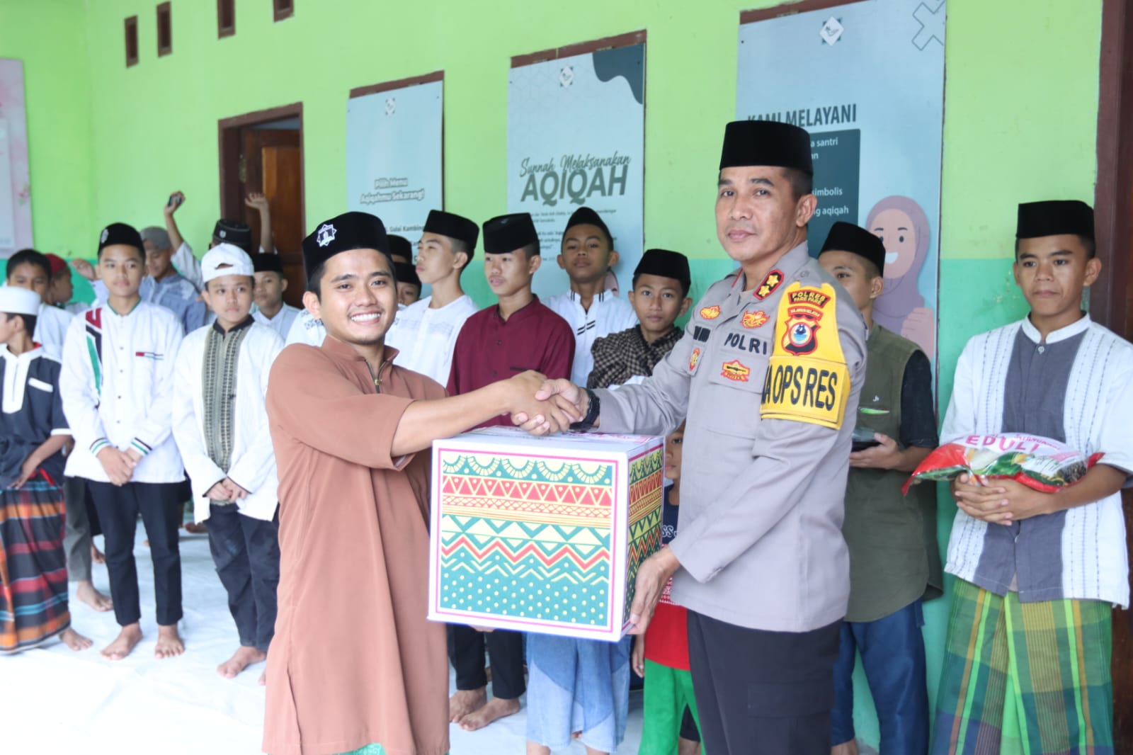 Penyerahan paket sembako di Pondok Pesantren dan Panti Asuhan Al Birru Jl. Marham Raya Kel. Bumi Harapan Kec. Bacukiki Barat Kota Parepare diserahkan langsung oleh Kapolres Parepare AKBP Arman Muis di dampingi oleh Ketua PYKB Cabang Parepare Daerah Sulawesi Selatan Ny. Lenny Arman dan Wakapores Parepare.