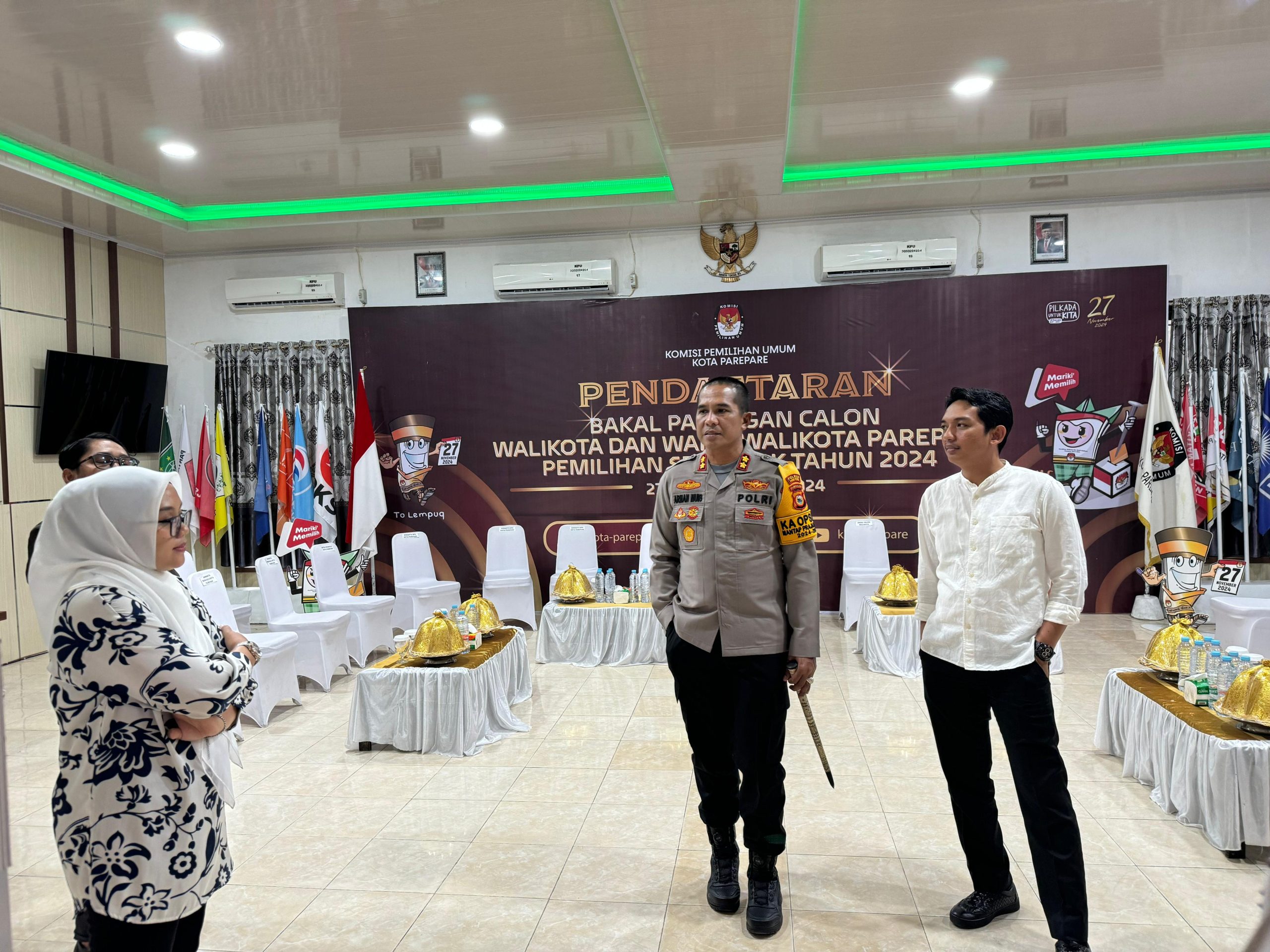 Parepare – Kapolres Parepare, AKBP Arman Muis memantau langsung persiapan tahapan pendaftaran bakal calon wali kota dan wakil wali kota di Kantor Komisi Pemilihan Umum (KPU), Rabu (28/8/2024).