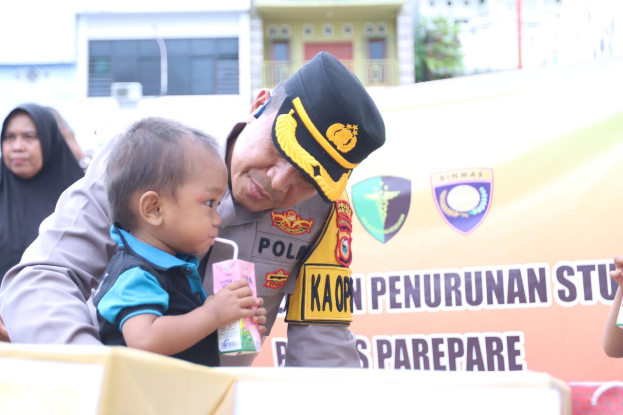 PAREPARE – Polres Parepare memberi bantuan pemenuhan makanan tambahan kepada 4 anak Stunting di Kota Parepare, Sulawesi Selatan, Sabtu (27/1/2024).