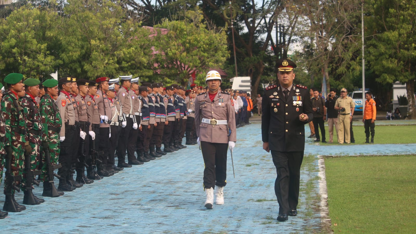 Barisan peserta upacara terdiri dari berbagai satuan gabungan, di antaranya personel Polres Pinrang, Kodim 1404 Pinrang, Dishub, Satpol PP, BPBD, Polhut, Damkar, serta para Bhabinkamtibmas dan staf gabungan.