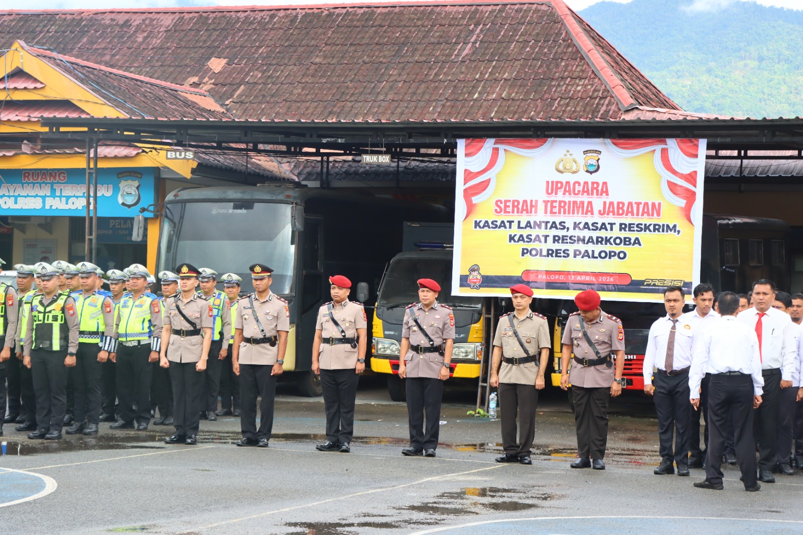 Palopo – Kepolisian Resor (Polres) Palopo melaksanakan upacara serah terima jabatan (sertijab) sejumlah pejabat utama, yakni Kasat Lantas, Kasat Narkoba, dan Kasat Reskrim pada Senin, 13 April 2026.
