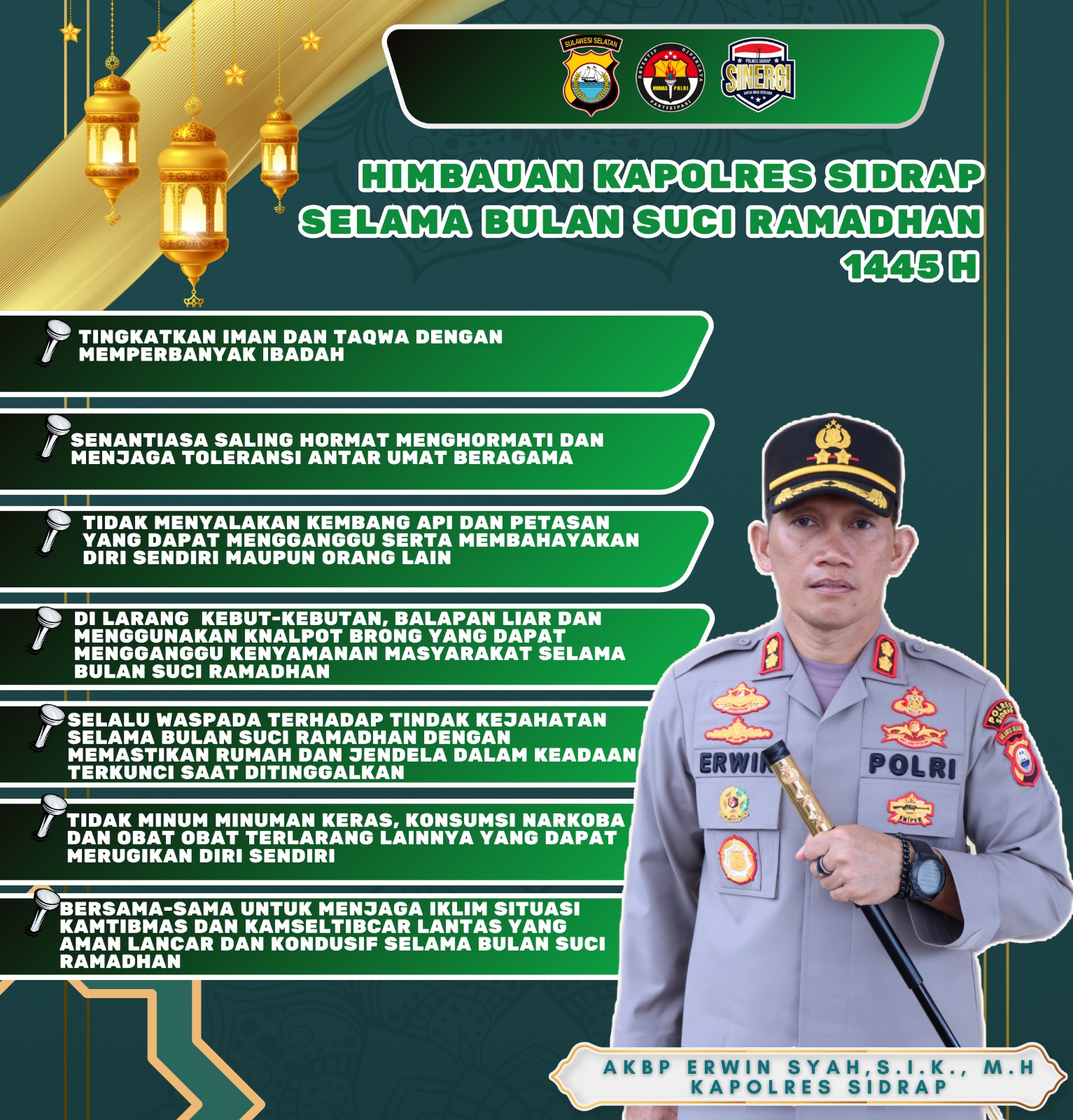 SIDRAP – Kapolres Sidrap AKBP Erwin Syah, S.I.K.M.H mengeluarkan himbauan dalam rangka untuk menjaga situasi keamanan dan ketertiban masyarakat (Kamtibmas) tetap kondusif selama bulan suci Ramadhan 1445 Hijriah tahun 2024.