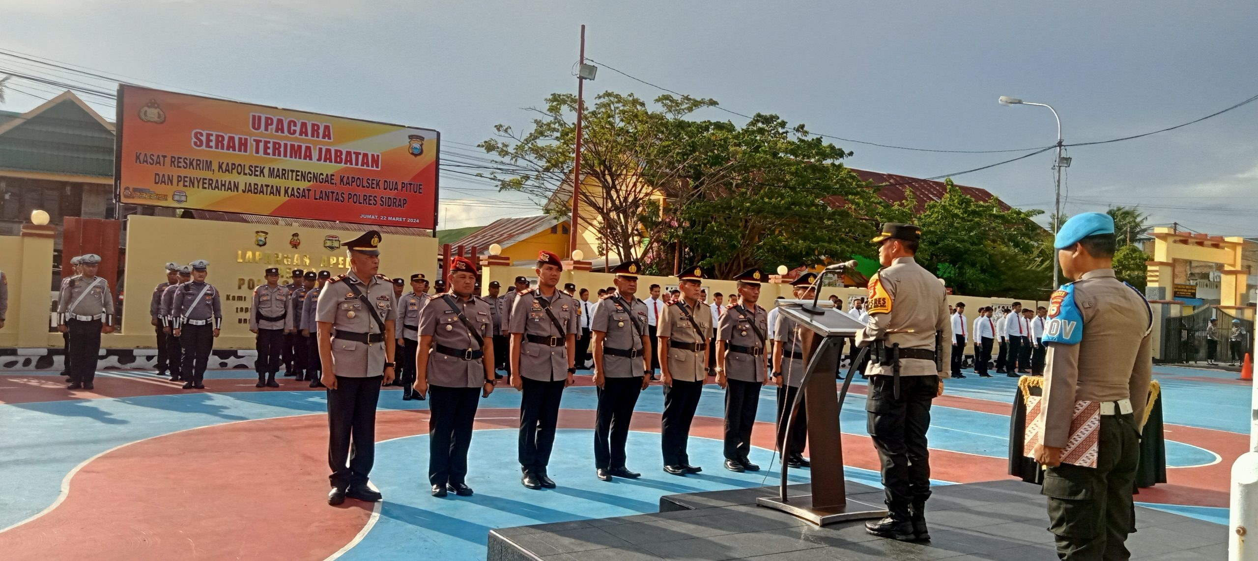 SIDRAP – Kapolres Sidrap AKBP Erwin Syah, S.I.K.M.H pimpin upacara serah terima jabatan (Sertijab) di Lapangan Apel Presisi Polres Sidrap, Jalan Bau Massepe No.01, Kelurahan Pangkajene, Kecamatan Maritengngae, Kabupaten Sidrap. Jumat sore (22/3/2024).