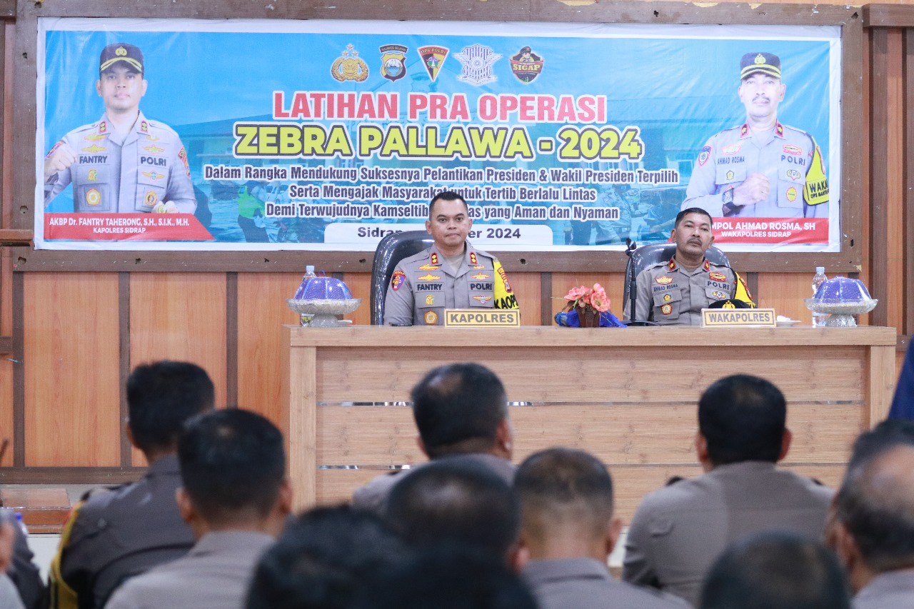 SIDRAP – Kapolres Sidrap, AKBP Dr. Fantry Taherong, S.H., S.I.K., M.H. secara resmi membuka Latihan Pra Operasi (Latpra Ops) Zebra Pallawa 2024 di Aula Polres Sidrap, Senin (14/10/2024).