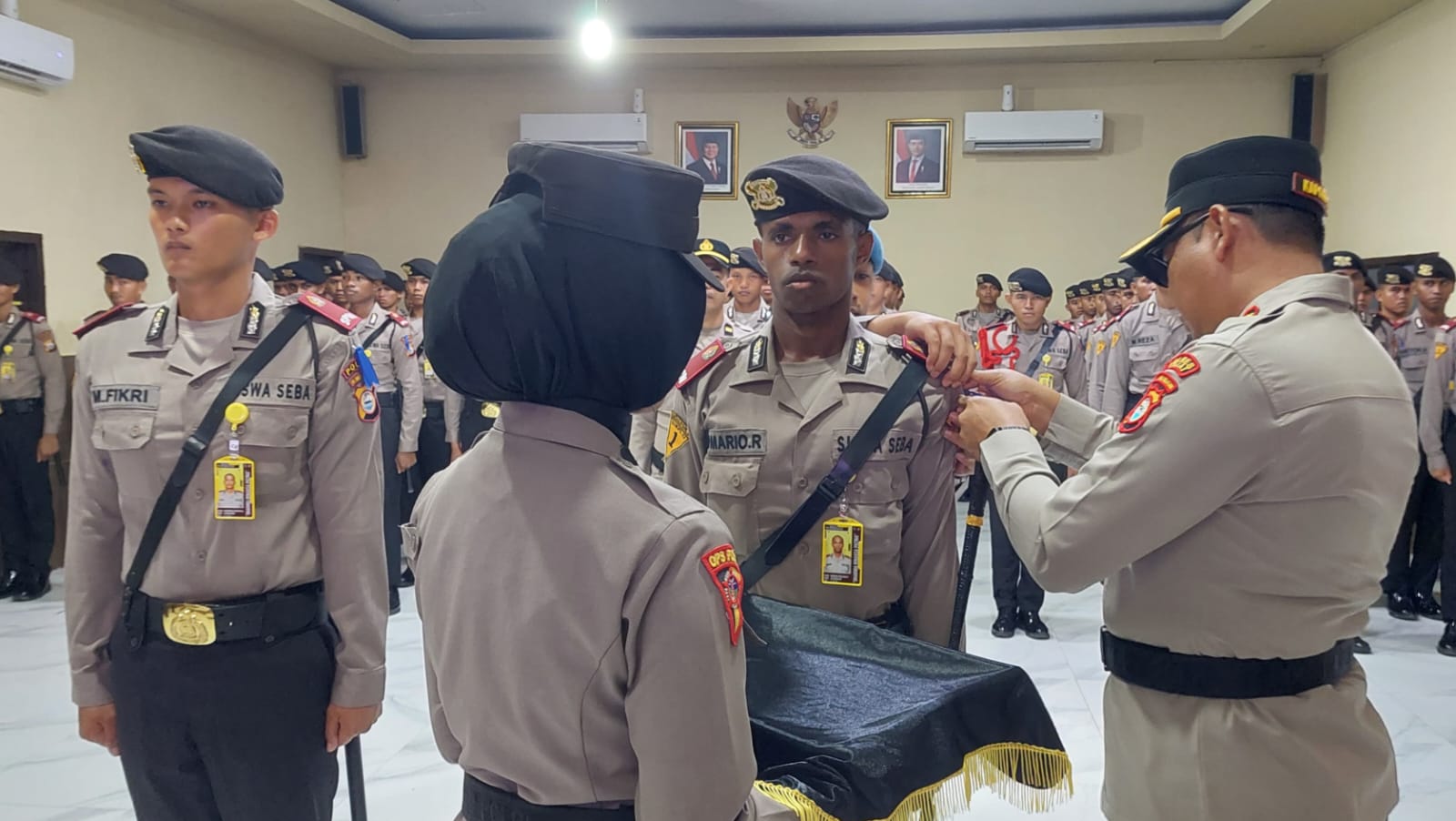 Dalam rangkaian kegiatan, dilakukan penyematan pita latihan kerja kepada perwakilan siswa Latja tanda latihan kerja bagi para siswa SPN Polda Sulsel di Mapolres Sinjai.