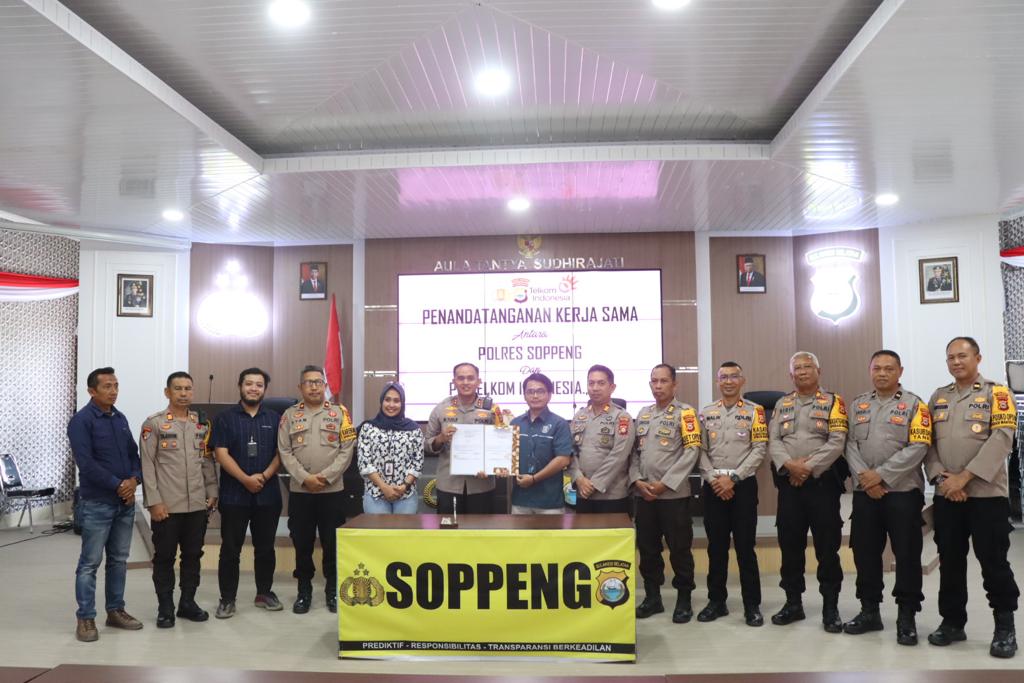 Polres Soppeng bersama PT Telkom Indonesia tbk melaksanakan penandatanganan kerjasama bertempat di aula tantya sudhirajati Polres Soppeng di jln la tenri Bali Watansoppeng Selasa 23 Januari 2024.