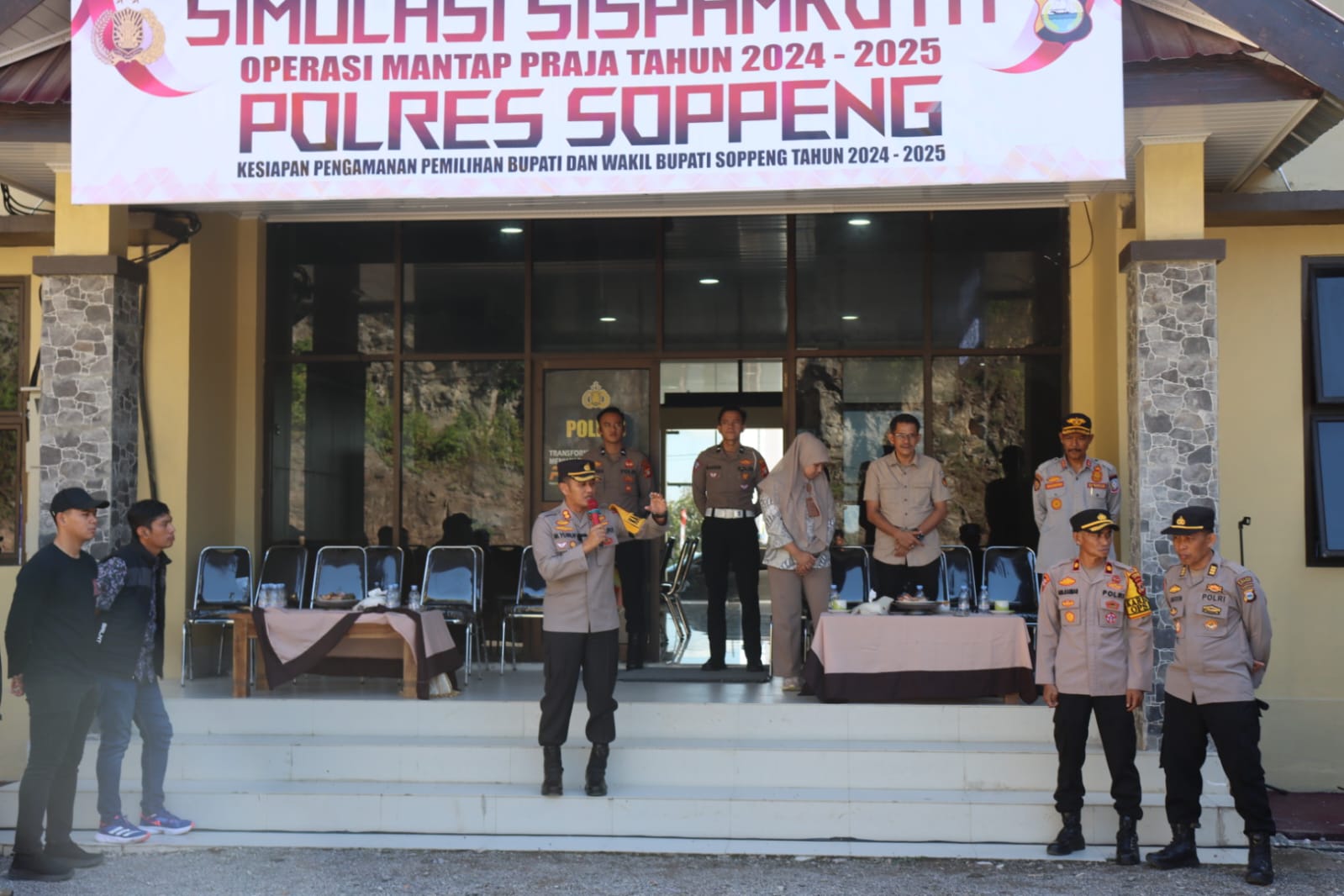 SOPPENG – Kepolisian Resor Soppeng,menggelar Simulasi sistem pengamanan kota (Sispamkota) dalam upaya antisipasi dan mempersiapkan pengamanan untuk menyukseskan Pemilukada Serentak 2024 -2025 Jumat 2 Agustus 2024 Bertempat di Halaman Mapolres Soppeng Jalan Tenribali Kelurahan LalabataRilau Kecamatan Lalabata Kabupaten Soppeng