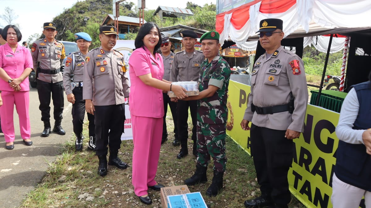 Dalam kunjungannya, Kapolres Tana Toraja bersama Ketua Bhayangkari Cabang Tana Toraja, Ny. Lusy Malacoppo menyerahkan bingkisan serta dukungan moril kepada personil pengamanan yang bertugas