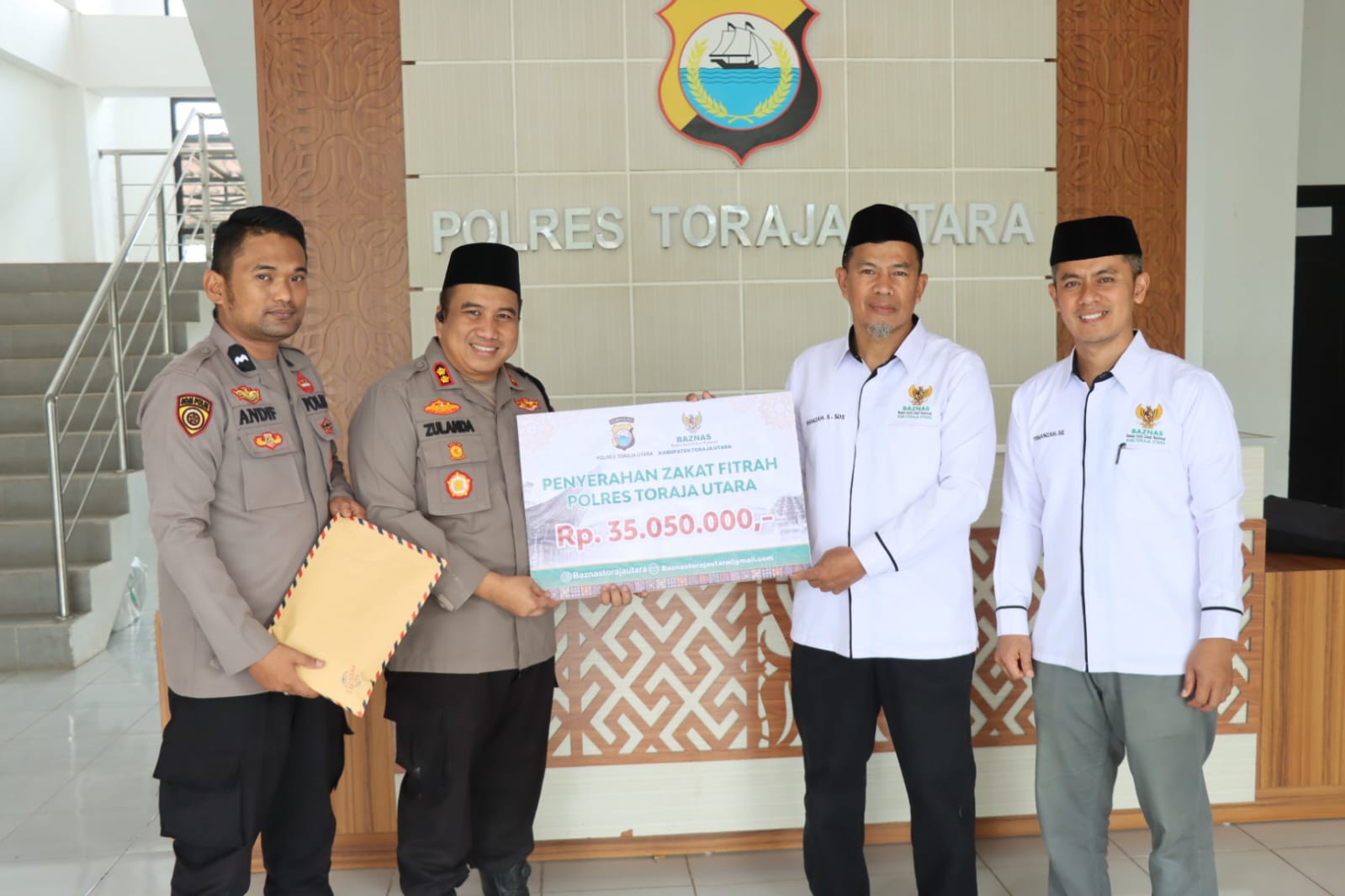 Jelang Hari Raya Idul Fitri 1446 H, Kapolres Toraja Utara AKBP Dr. Zulanda, S.I.K., M.Si, secara resmi menyerahkan zakat fitrah personel Polres Toraja Utara dan Polsek jajaran kepada Badan Amil Zakat Nasional (BAZNAS) Kabupaten Toraja Utara.
