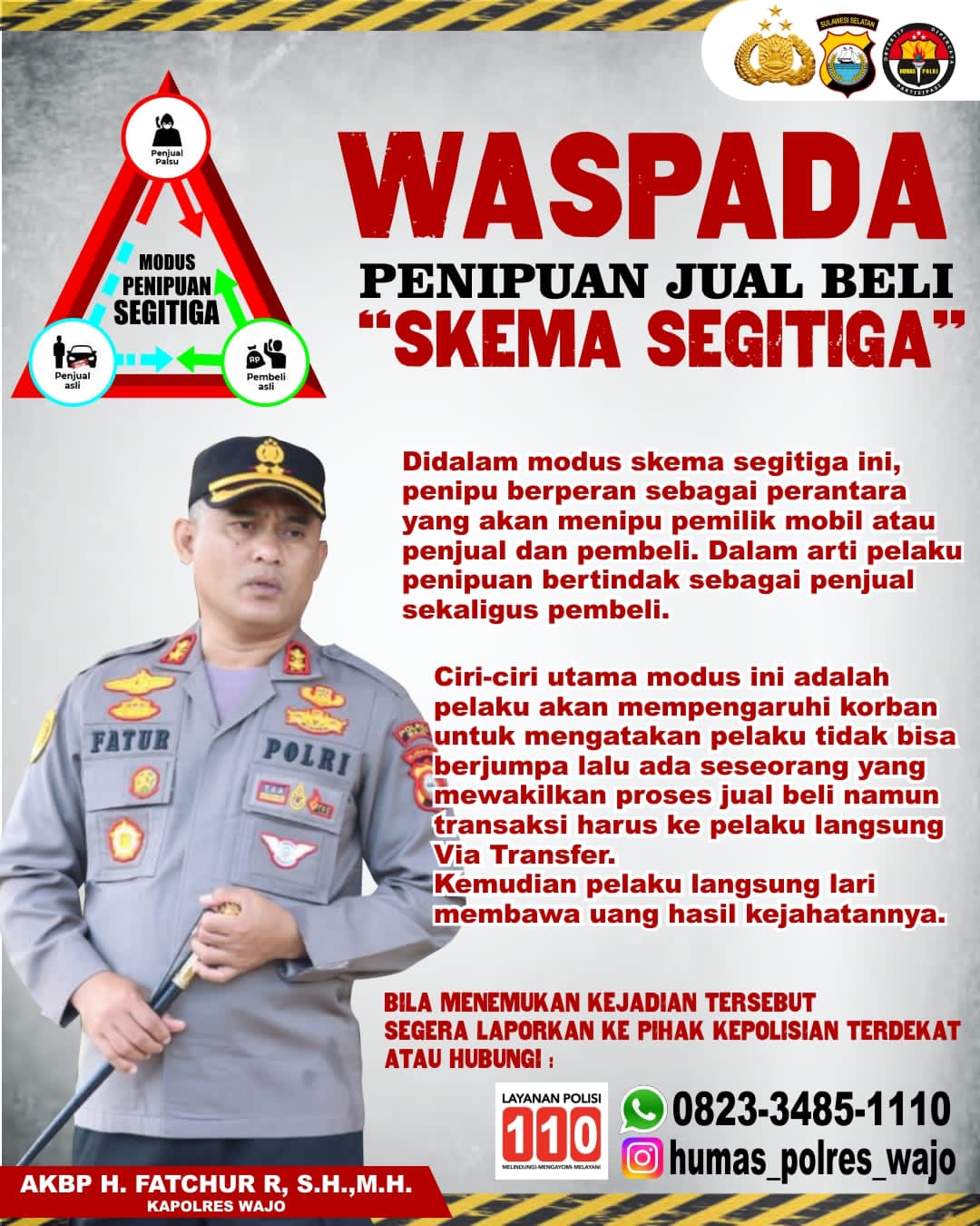 WAJO – Kapolres Wajo AKBP H.Fatchur Rochman, S.H.,MH mengajak seluruh elemen masyarakat Kabupaten Wajo untuk tetap Waspada Penipuan dalam Jual Beli dengan skema Segitiga. Rabu (23/1/2024).