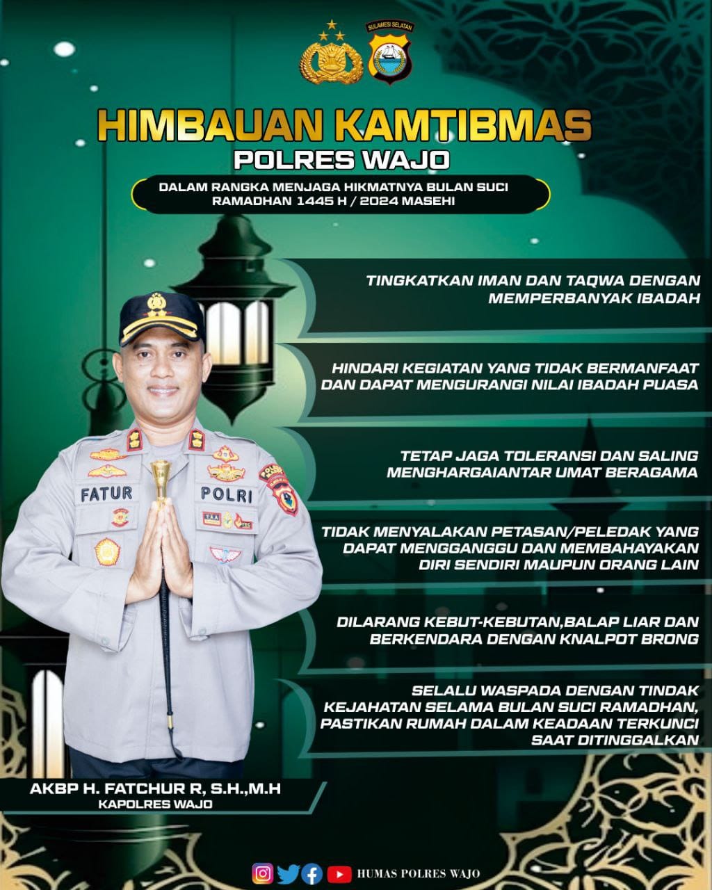 WAJO _ Kapolres Wajo AKBP H. Fatchur R kembali menghimbau masyarakat untuk mengantisipasi potensi kerawanan dan gangguan kamtibmas menjelang datangnya bulan suci Ramadhan dan menjaga hikmatnya bulan suci Ramadhan 1445 h / 2024 Masehi