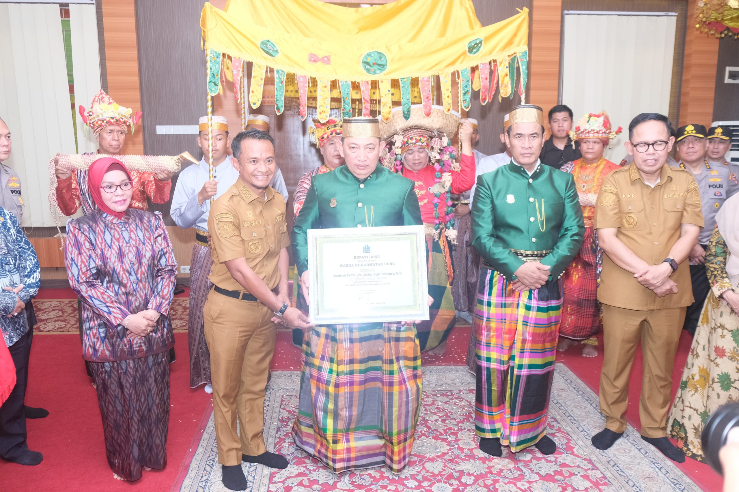 Bone, Sulawesi Selatan — Kepala Kepolisian Negara Republik Indonesia (Kapolri) Jenderal Polisi Drs. Listyo Sigit Prabowo, M.Si., menerima gelar adat kehormatan “Lapateddungi Daeng Pasamppo” dari Dewan Adat Kabupaten Bone, Sulawesi Selatan. Prosesi pengukuhan berlangsung khidmat di sela kunjungan kerja Kapolri mendampingi Menteri Pertanian Republik Indonesia, Dr. Ir. H. Andi Amran Sulaiman, MP., dalam kegiatan panen raya jagung di Desa Bolli, Kecamatan Ponre, Jumat, 16 Mei 2025.