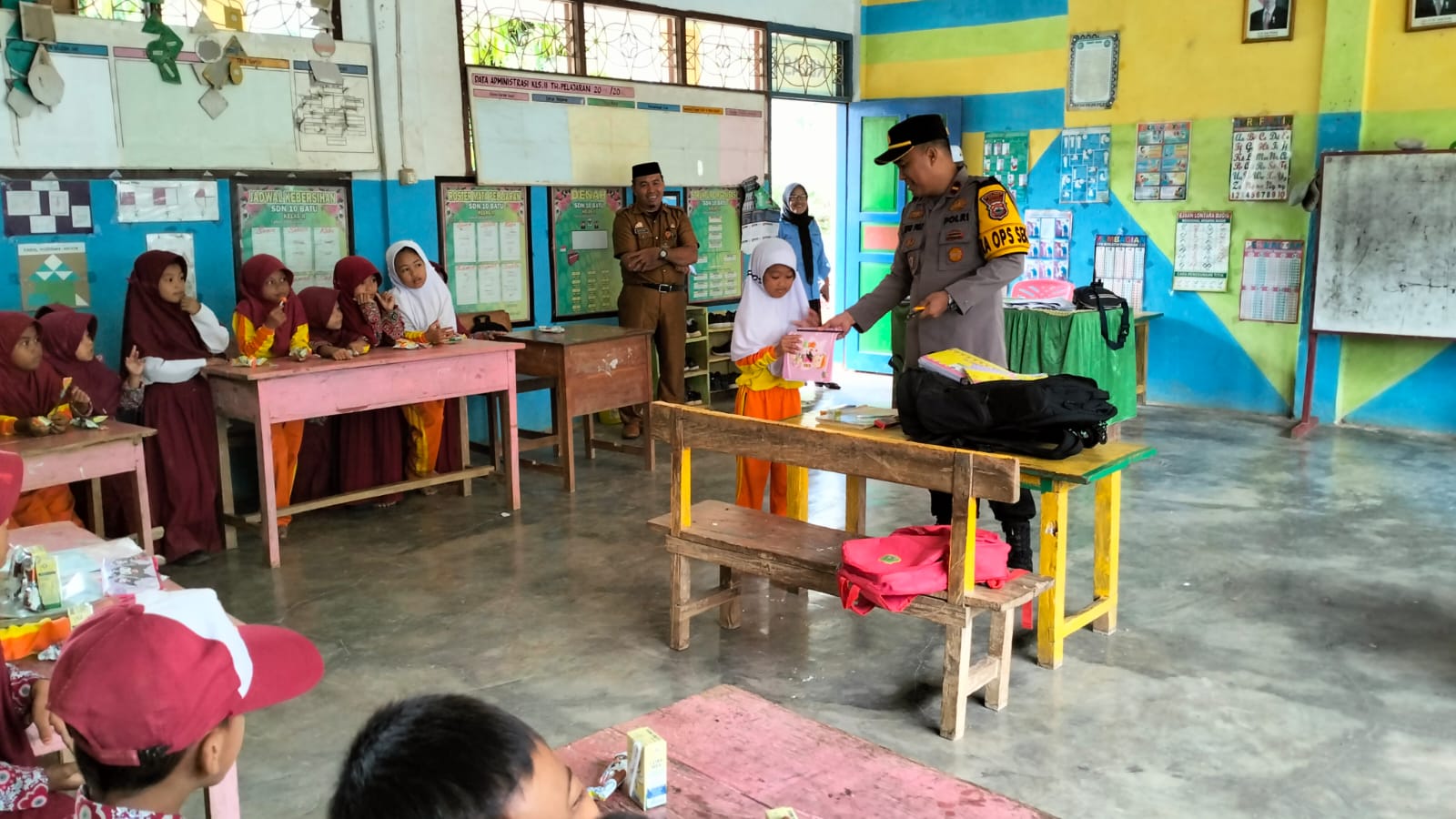 Dalam kesempatan tersebut, IPDA Jufri. SH juga membawa berbagai bantuan berupa snack, susu kotak serta alat tulis dan buku bacaan untuk menunjang proses belajar-mengajar di sekolah.