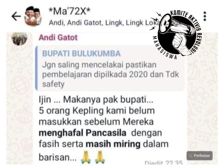 Bulukumba – Netralitas aparatur sipil negara (ASN) dalam pilkada bulukumba kembali dipertanyakan setelah beredarnya obrolan grup whatsapp (WA) tentang pengarahan lurah dan kepala lingkungan yang di lakukan oleh salah satu camat di kabupaten bulukumba.