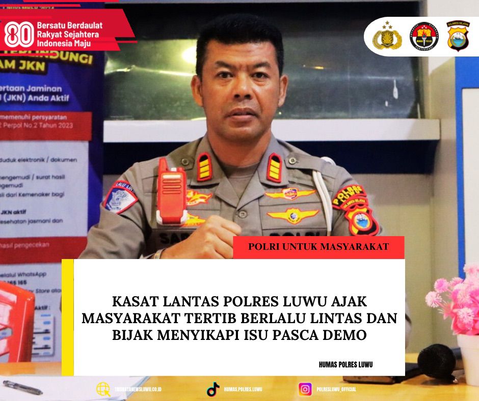 Luwu – Menyikapi maraknya isu pasca demonstrasi di berbagai wilayah, Kasat Lantas Polres Luwu, AKP Sarifuddin, S.H., M.H., mengimbau masyarakat Kabupaten Luwu, khususnya para pengguna jalan raya, agar selalu mematuhi aturan lalu lintas demi keselamatan bersama.