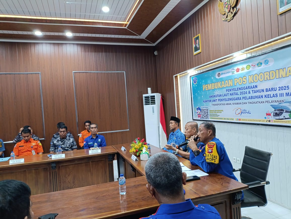Polres Majene – Kepala Satuan Polisi Perairan (Kasat Polair) Polres Majene, Iptu Muh. Alim Haeba, menghadiri acara pembukaan Pos Koordinasi Penyelenggaraan Angkutan Laut Natal 2024 dan Tahun Baru 2025 yang digelar di Aula Kantor Unit Penyelenggara Pelabuhan (UPP) Kelas III Majene, Selasa (17/12/2024).