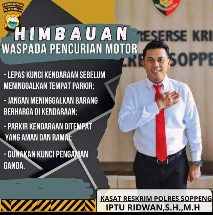 Kepala Kepolisian Resor (Kapolres) Soppeng AKBP H. Muhammad Yusuf Usman melalui Kepala Satuan Reserse dan Kriminal (Kasat Reskrim) Polres Soppeng IPTU Ridwan menghimbau kepada lapisan masyarakat khususnya di Kabupaten Soppeng agar tetap waspada dan berhati-hati dalam menjaga kendaraan dalam segi keamanan.