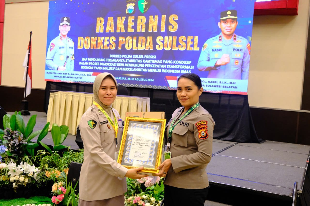 Penyeraham piagam penghargaan diserahkan Kapolda Sulsel melalui Biddokkes Polda Sulsel kepada Polres Tana Toraja yang diwakilkan oleh Kasi Dokkes Polres Tator Aipda Yustina Sartika di Hotel Dalton Makassar.