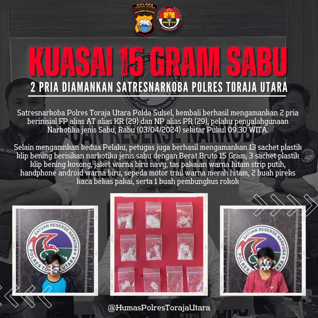 Satuan Reserse Narkotika dan Obat Berbahaya (Satresnarkoba) Polres Toraja Utara Polda Sulsel, kembali berhasil mengamankan 2 pria pelaku penyalahgunaan Narkotika jenis Sabu, Rabu (03/04/2024) sekitar Pukul 09.30 WITA.