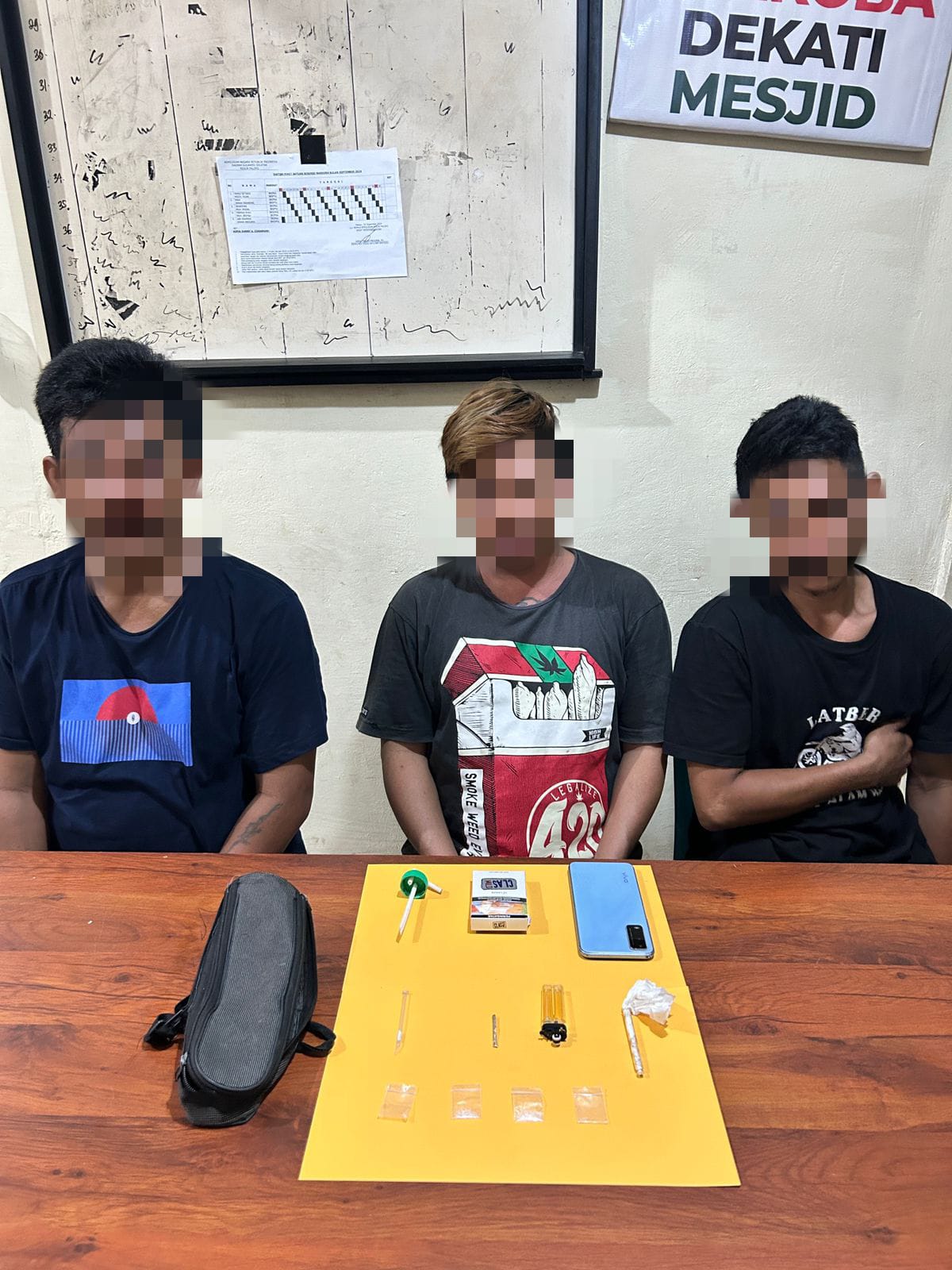 Dari ketiganya, polisi juga mengamankan tiga sachet plastik bening dengan berat 0,50 gram, alat isap, kaca pirex, sendok sabu, sumbu yang terbuat dari filter rokok, dan HP.