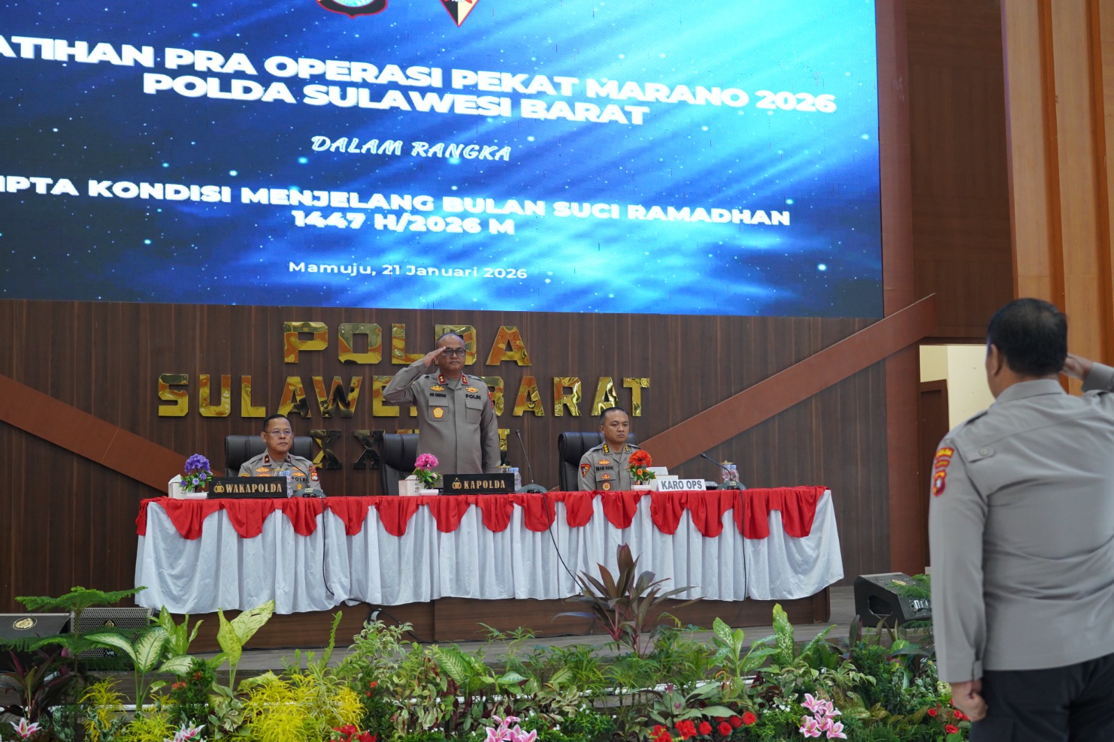 Polda Sulbar – Guna memastikan pelaksanaan optimal Operasi Pekat Marano-2026, Polda Sulbar menggelar Pelatihan Pra Operasi (Latpra) yang melibatkan seluruh jajarannya, Rabu (21/1/26) di Aula Marannu Mapolda.