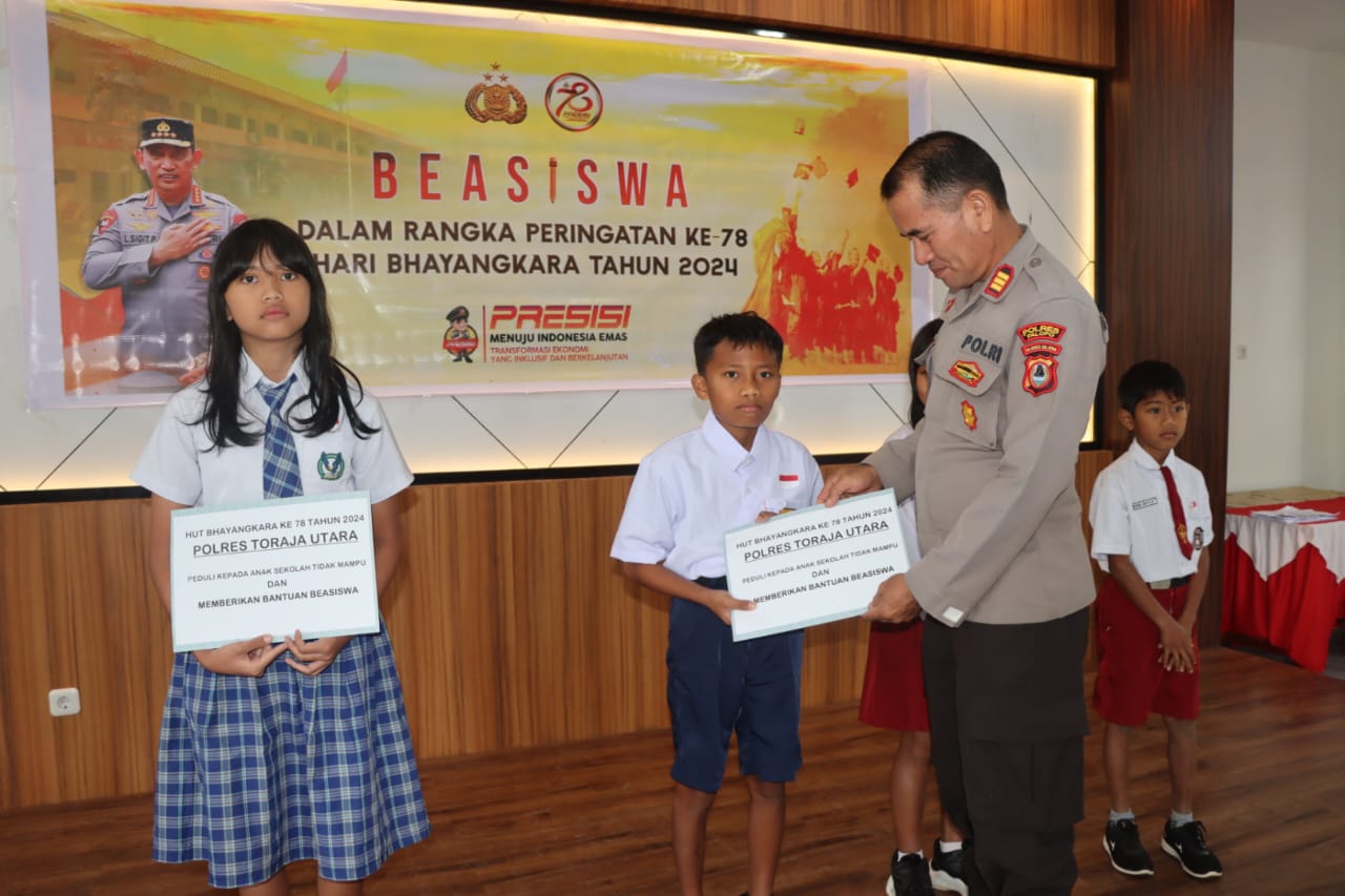 Menyambut Hari Bhayangkara ke-78, Polres Toraja Utara Polda Sulsel memberikan beasiswa kepada lima pelajar dari jenjang Sekolah Dasar (SD), Sekolah Menengah Pertama (SMP), dan Sekolah Menengah Atas (SMA), Kamis (27/06/2024)