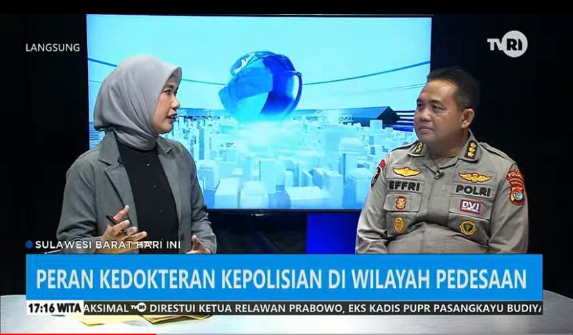 Polda Sulbar – Mengisi acara bincang Malaqbi di Studio TVRI Sulbar, Kabid Dokkes Kombes Pol dr. Effri Susanto mengungkapkan kedokteran Polda Sulbar selain mempunyai peran penting dalam mendukung tugas utama di Kepolisian juga hadir untuk memperkuat upaya pemerintah daerah dalam memberikan solusi kesehatan kepada masyarakat.