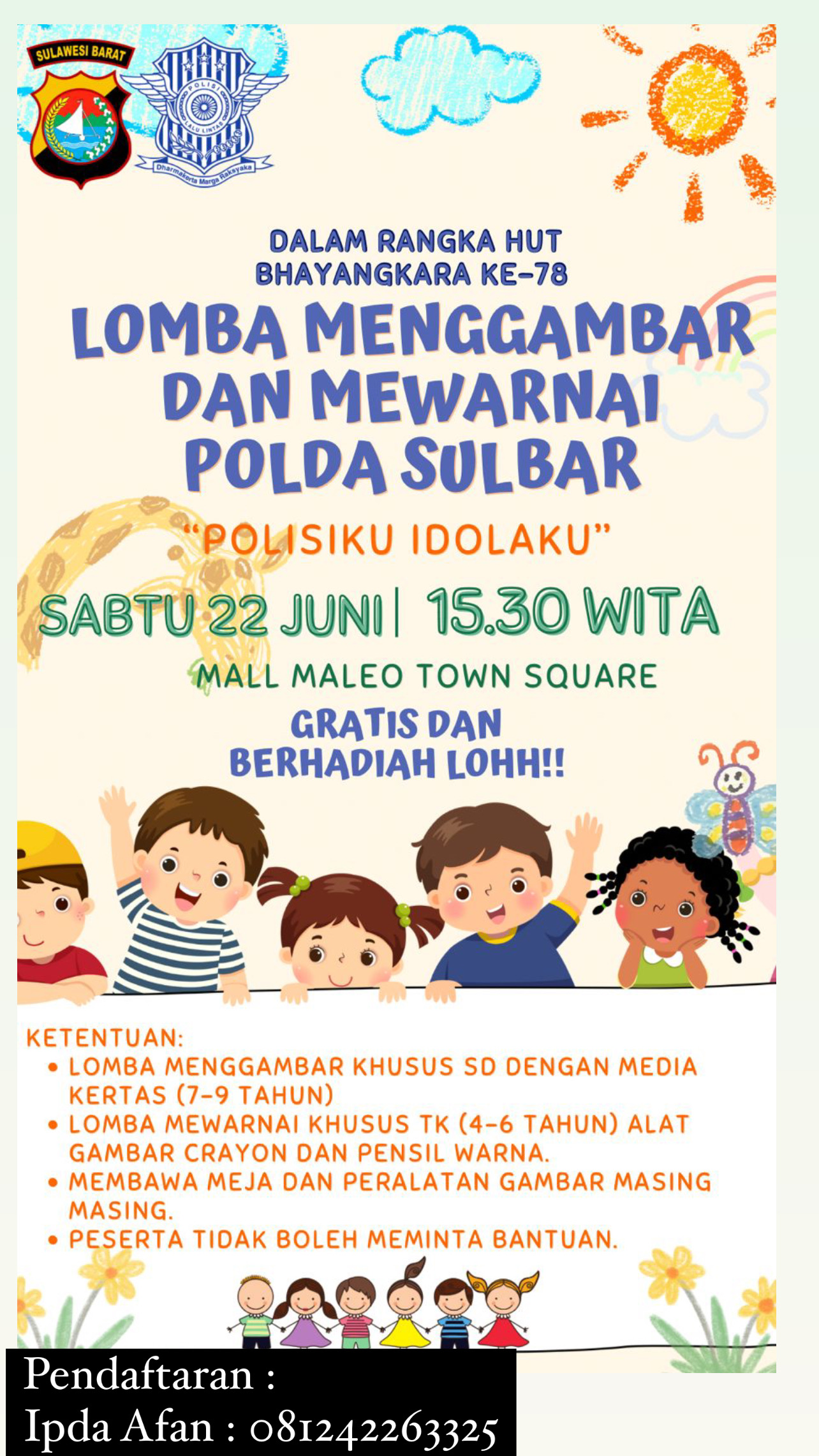 Pendaftaran lomba bisa melalui nomor telpon 081242263325 atas nama IPDA Afan, jangan lupa daftarkan anaknya ya Bunda!