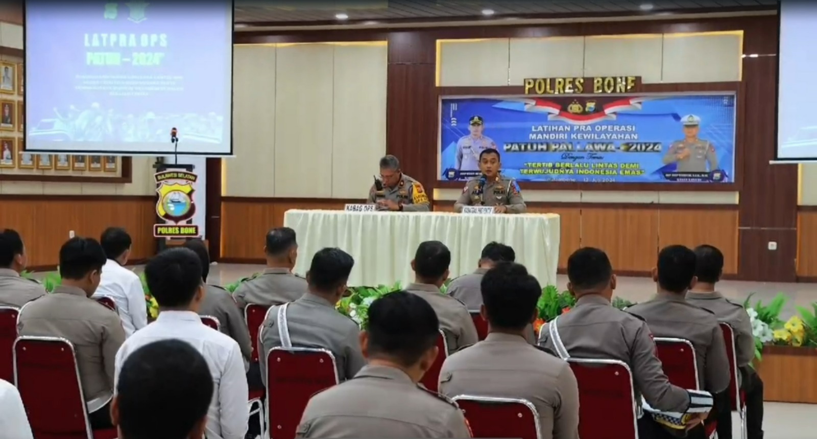 Bone – Menjelang pelaksanaan Operasi Patuh Pallawa2024, Polres Bone melaksanakan latihan pra operasi (Latpraops) yang dibuka oleh Kabag Ops Polres Bone Kompol Antonius Tuleta., didampingi oleh Kasat Lantas Polres Bone Akp Asep Wahyudi. Acara ini berlangsung di Aula Sarja Arya Racana Polres Bone pada Senin (15/07/2024).Pagi.