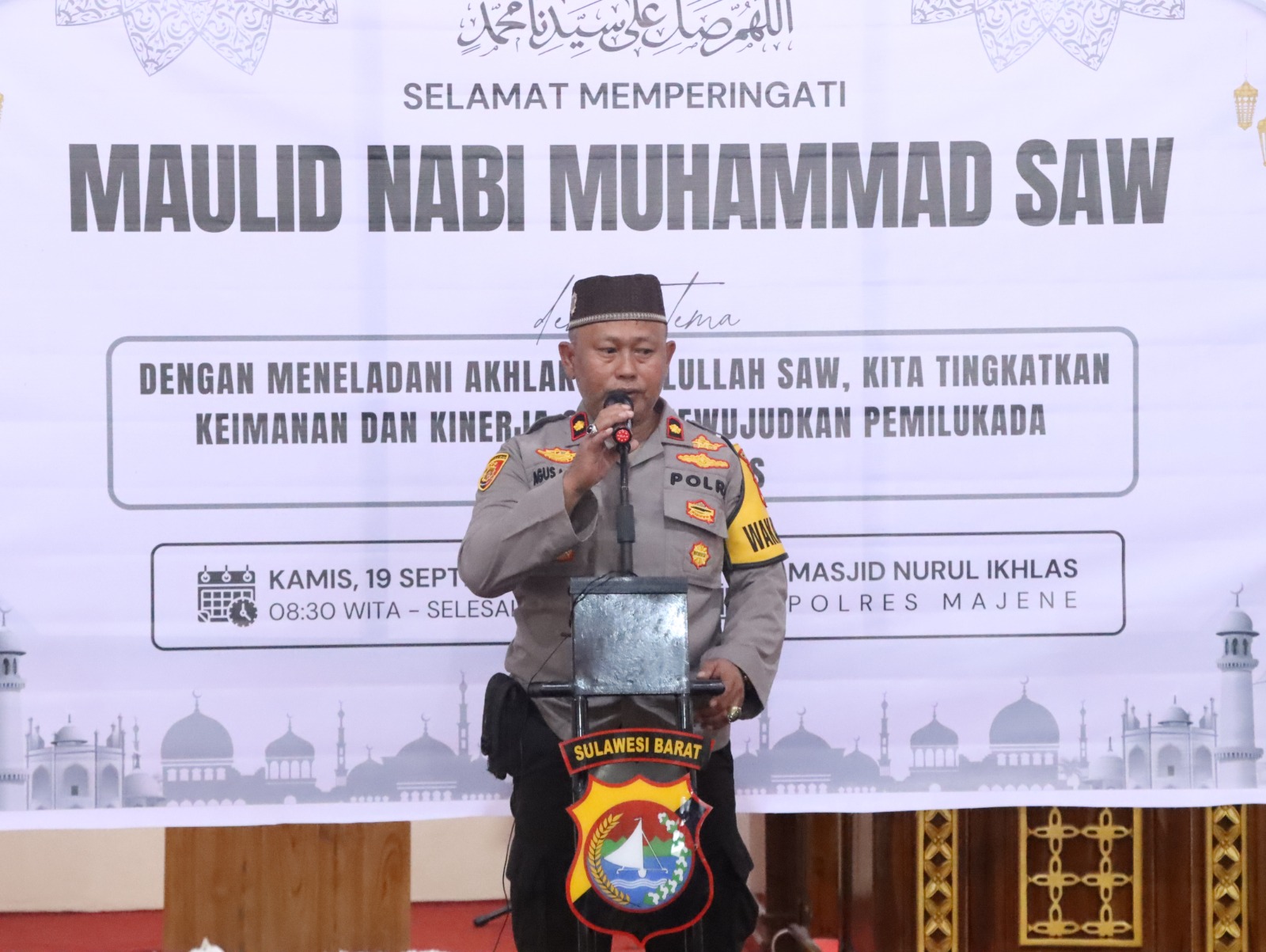 Dalam sambutannya, Wakapolres Majene, Kompol Agussalim Arsyad, menegaskan pentingnya peringatan Maulid Nabi sebagai kesempatan untuk memperdalam pemahaman mengenai kehidupan dan keteladanan Rasulullah SAW.