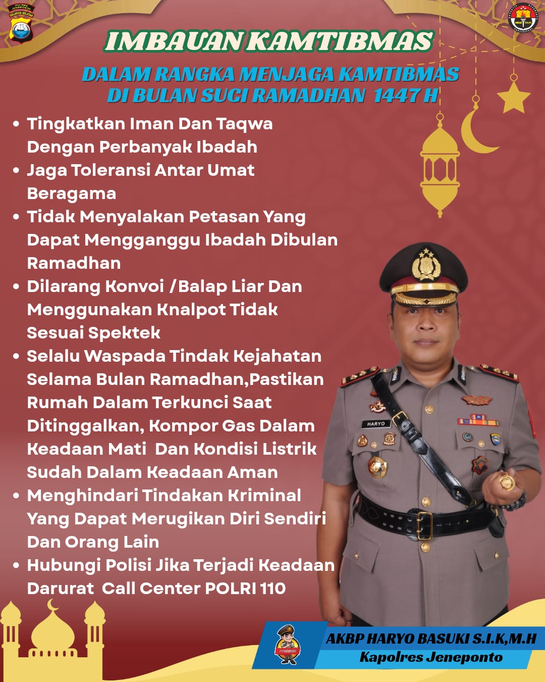 Jeneponto – Menyambut Bulan Suci Ramadhan 1447 Hijriah, Kapolres Jeneponto AKBP Haryo Basuki, S.I.K., M.H mengeluarkan imbauan kamtibmas kepada seluruh masyarakat agar bersama-sama menjaga keamanan dan ketertiban selama bulan penuh berkah.