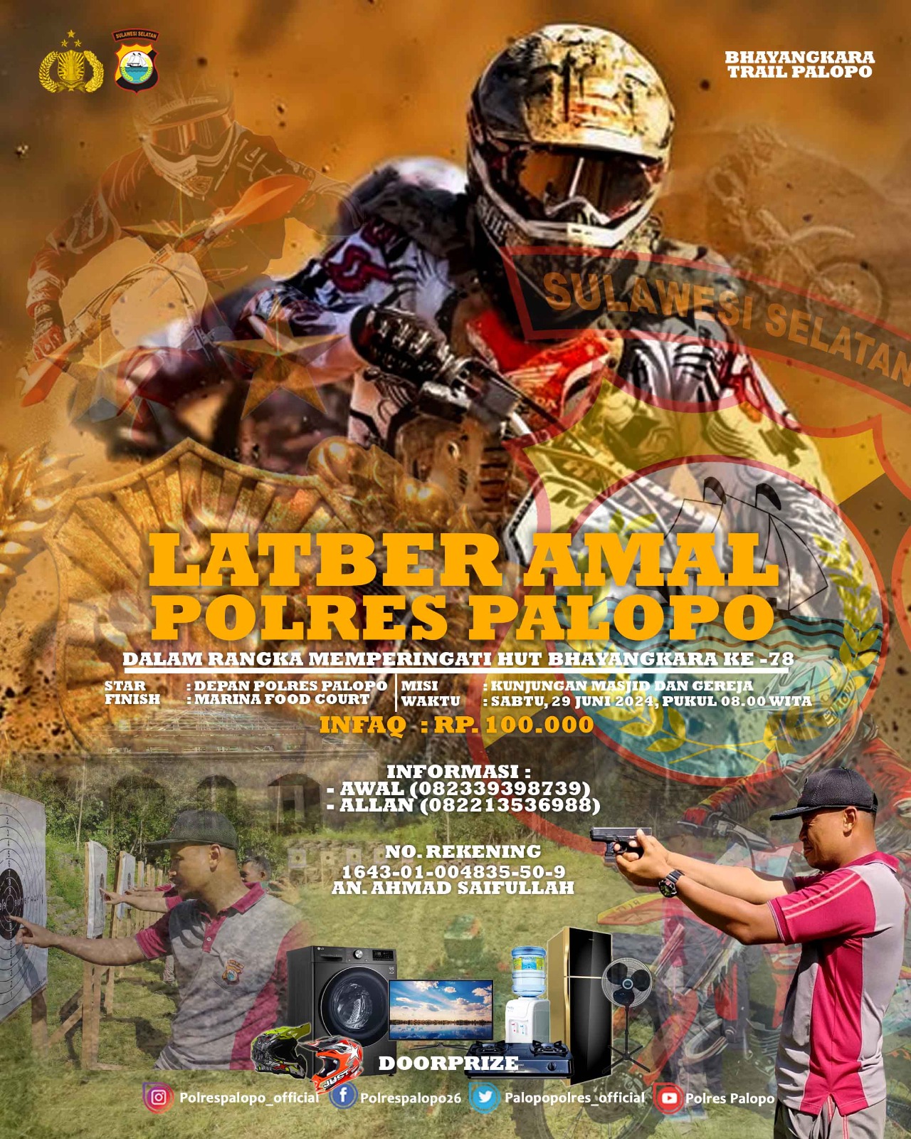 Kepada Awak Media ,Kapolres Palopo ,AKBP Safi’i Nafsikin mengatakan bahwa Polres Palopo dalam waktu dekat ini akan mengelar Event Trail Latber Amal dalam rangka Hut Bhayangkara Ke -78.Dengan membawa Misi Kunjungan Masjid dan Gereja semua peserta mulai star di depan polres Palopo kemudian memasuki jalur ekstrim kemudian Tim Latber merapat ke lapangan tembak dan setelah itu kembali bergerak ke Jalur Lintasan menunju ke Masjid dan Gereja dengan tujuan memberikan memasukan bantuan ke kotak amal