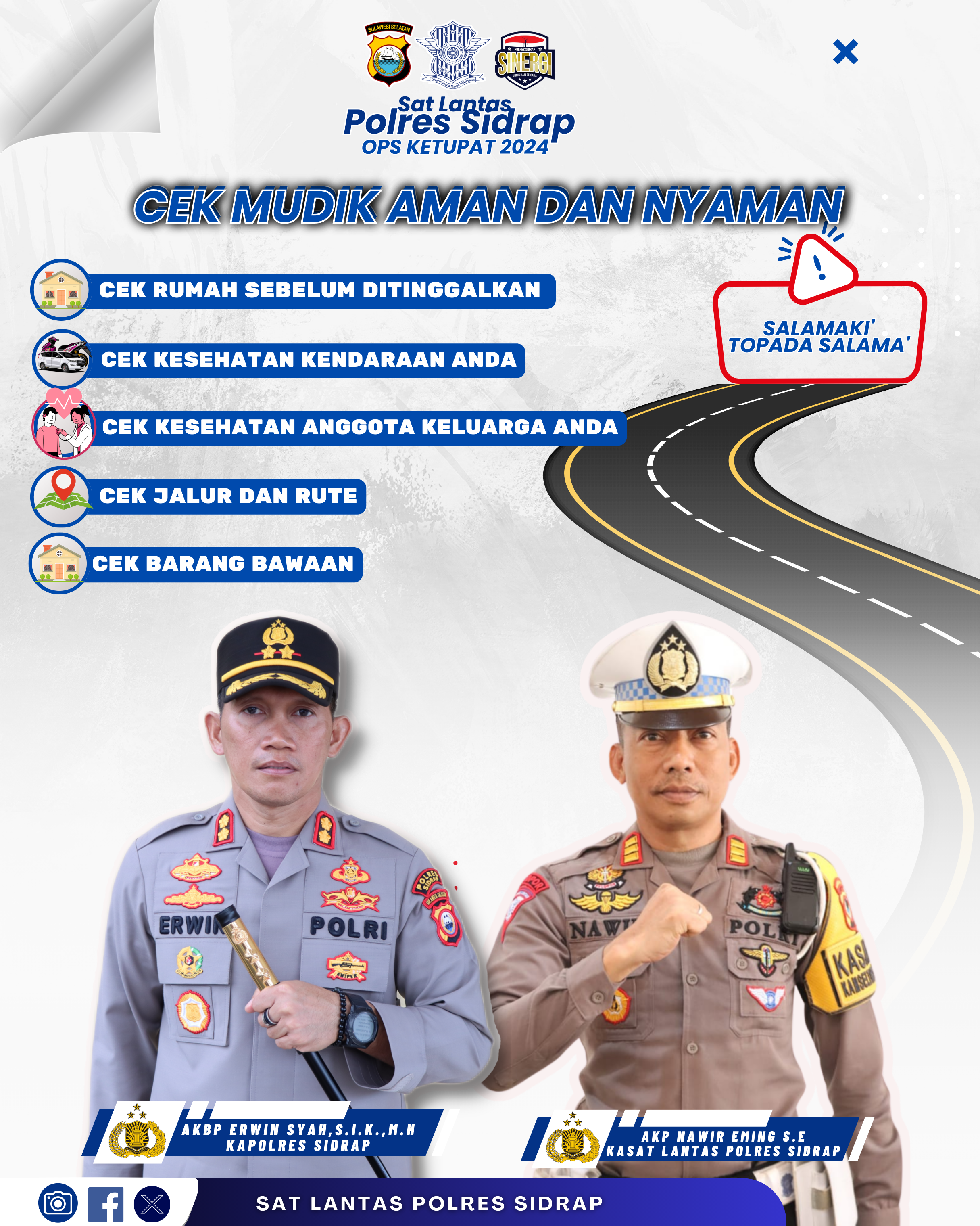 SIDRAP SULSEL – Menjelang mudik lebaran tahun 2024 ini, Kapolres Sidrap Erwin Syah memberikan sejumlah imbauan kepada masyarakat, terutama yang akan melakukan mudik dan meninggalkan rumah.
