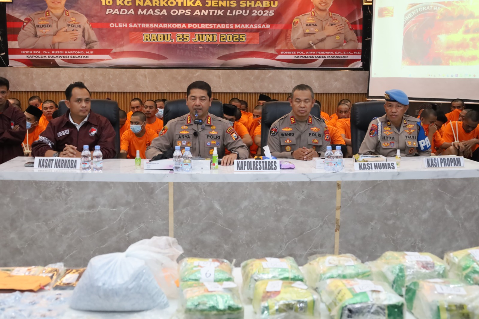 Konferensi pers digelar di Aula Mappaodang Polrestabes Makassar, Rabu (25/06/2025), dan dipimpin langsung oleh Kapolrestabes Makassar Kombes Pol Arya Perdana, SH, SIK, M.Si, didampingi Kasat Narkoba AKBP Lulik Febrianto, SIK, MH, serta Kasi Humas Polrestabes Makassar AKP Wahiduddin.