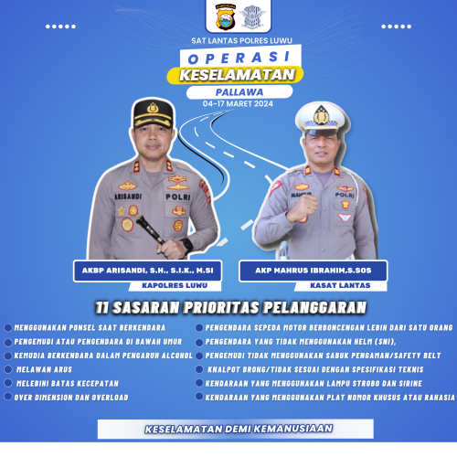 LUWU – Satuan Lalu Lintas (Satlantas) Polres Luwu jajaran Polda Sulsel akan menggelar Operasi Keselamatan Pallawa yang dilaksanakan serentak di seluruh Indonesia pada tanggal 4-17 Maret 2024