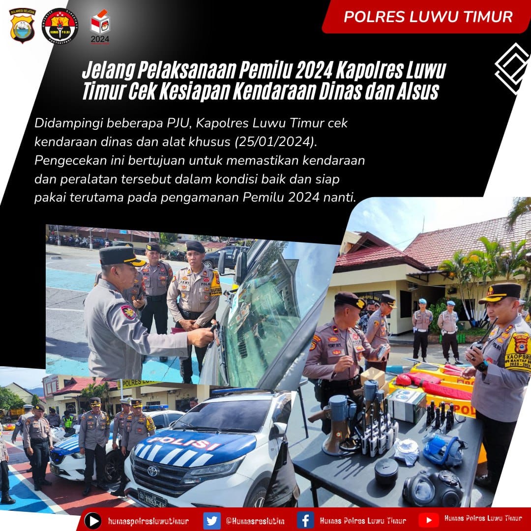 LUWU TIMUR SULSEL – Mengoptimalkan pengamanan pemilu 2024, Polres Luwu Timur melakukan cek rutin kesiapan kendaraan dinas seluruh personel. Kamis (25/1/2024).