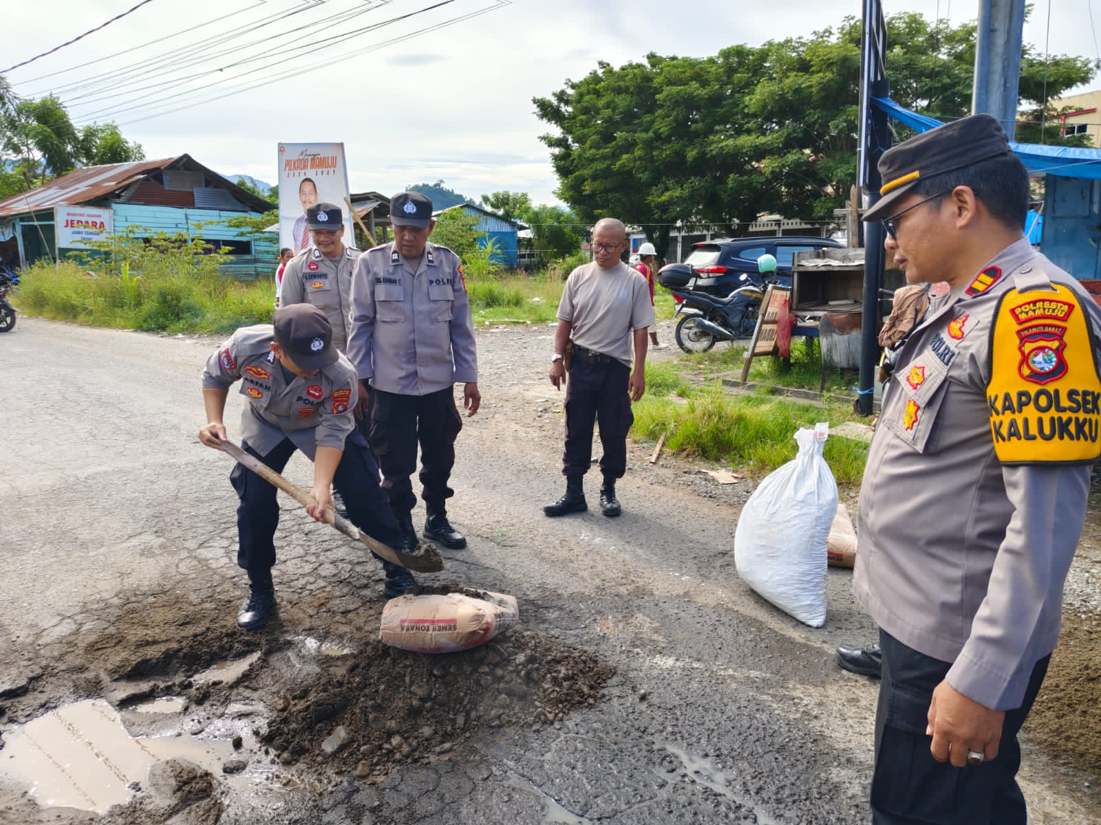 Peduli akan keselamatan masyarakat di jalan raya merupakan salah satu yang ditekankan Kapolsek Kalukku Iptu Makmur pimpin langsung kerja Bakti penambalan jalan berlubang tersebut