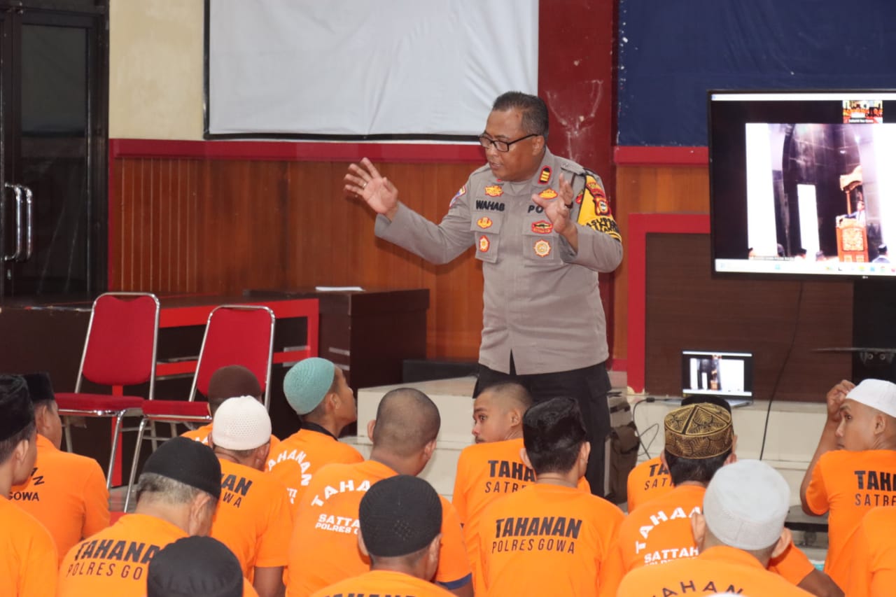 Kapolres Gowa, AKBP R.T.S. Simanjuntak, S.H, S.I.K, M.M, M.I.K., memberikan kesempatan kepada tahanan untuk melaksanakan shalat tarawih berjamaah dengan pengamanan yang ketat oleh personel non-Muslim, Selasa (20/03/2024) Malam.