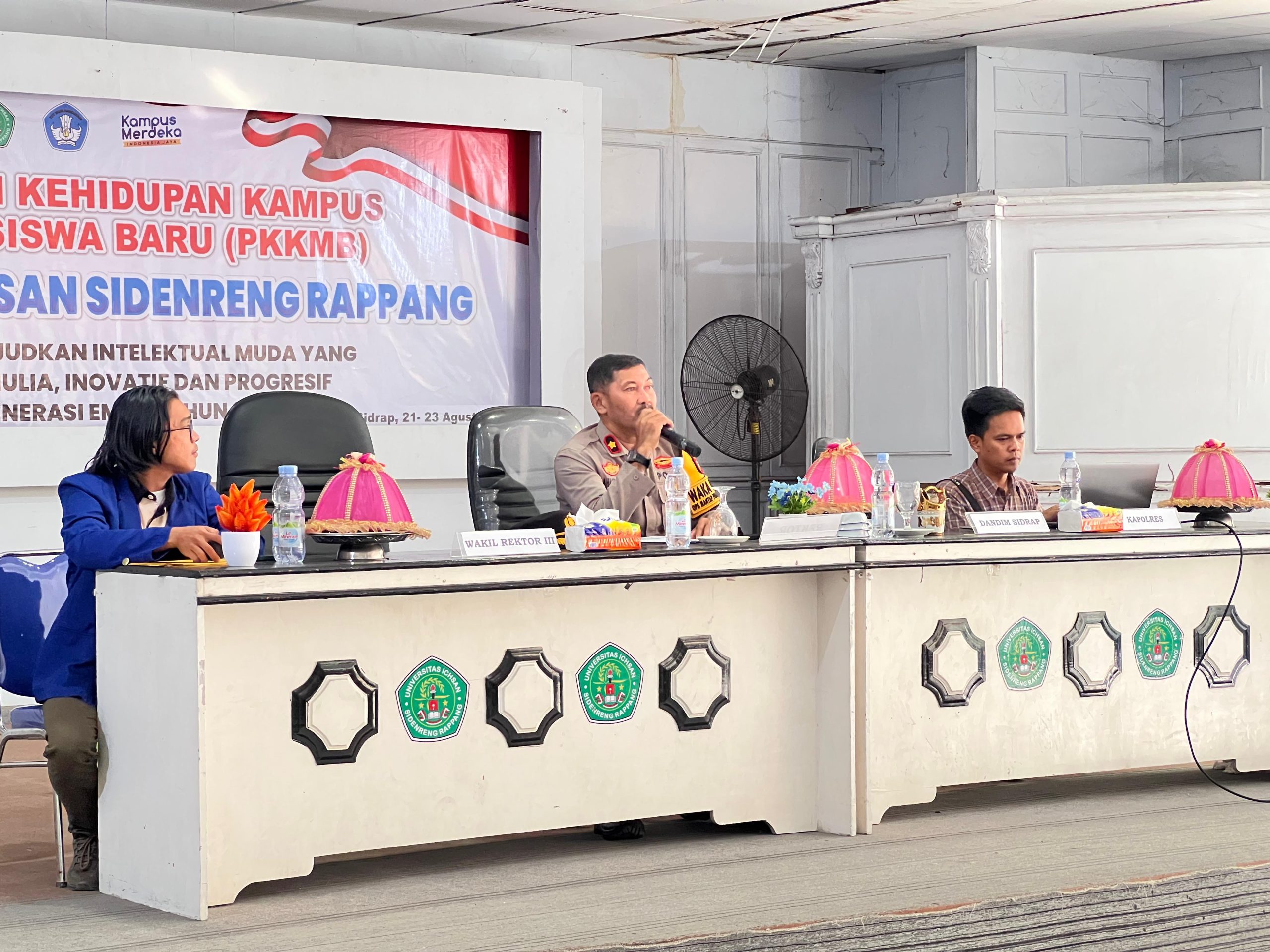 SIDRAP – KOMPOL Ahmad Rosma, Wakapolres Sidrap, mewakili Kapolres Sidrap dalam acara pengenalan lingkungan kampus bagi mahasiswa baru yang berlangsung di Aula Universitas Sidrap, pada hari Rabu (21/08/24). Acara ini merupakan bagian dari rangkaian kegiatan orientasi yang bertujuan untuk memberikan pemahaman tentang lingkungan akademik dan peran serta tanggung jawab sebagai mahasiswa baru.