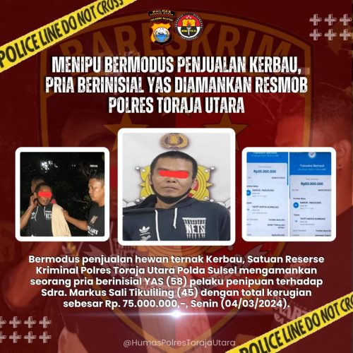Dijelaskan oleh Kasat Reskrim, YAS mengakui perbuatannya telah memperdaya Korban Markus Sali Tikuliling dengan melakukan penipuan bermodus penjualan kerbau sebesar 75 juta rupiah.
