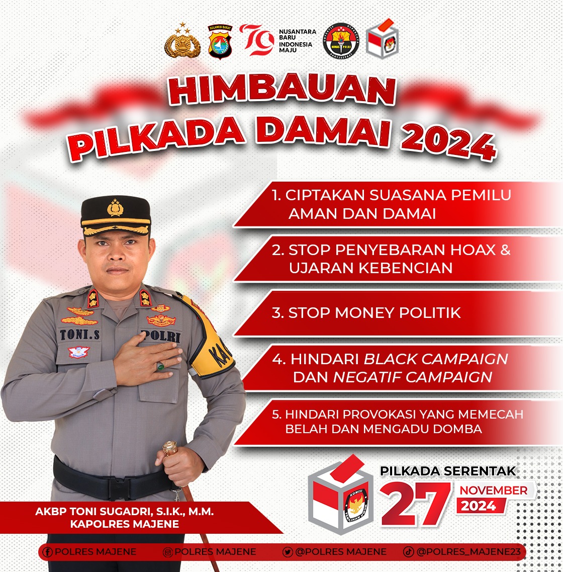 Majene – Menjelang pelaksanaan Pilkada Serentak 2024, Kapolres Majene, AKBP Toni Sugadri, S.I.K., mengeluarkan himbauan penting kepada seluruh masyarakat Kabupaten Majene. Himbauan tersebut bertujuan untuk menciptakan suasana pemilu yang aman, damai, dan kondusif.