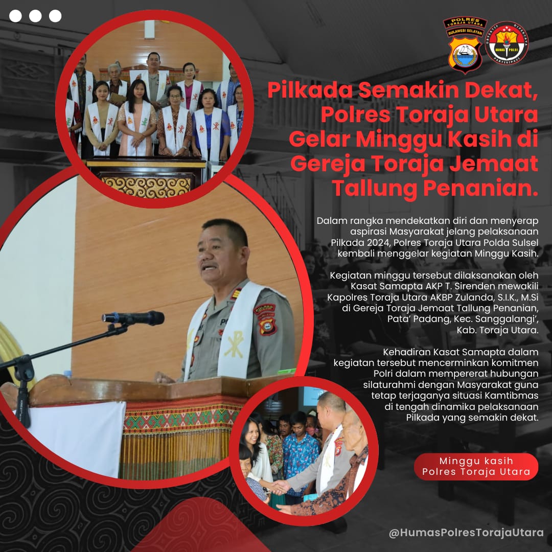 Kegiatan minggu tersebut dilaksanakan oleh Kasat Samapta AKP T. Sirenden mewakili Kapolres Toraja Utara AKBP Zulanda, S.I.K., M.Si di Gereja Toraja Jemaat Tallung Penanian, Pata’ Padang, Kec. Sanggalangi’, Kab. Toraja Utara.