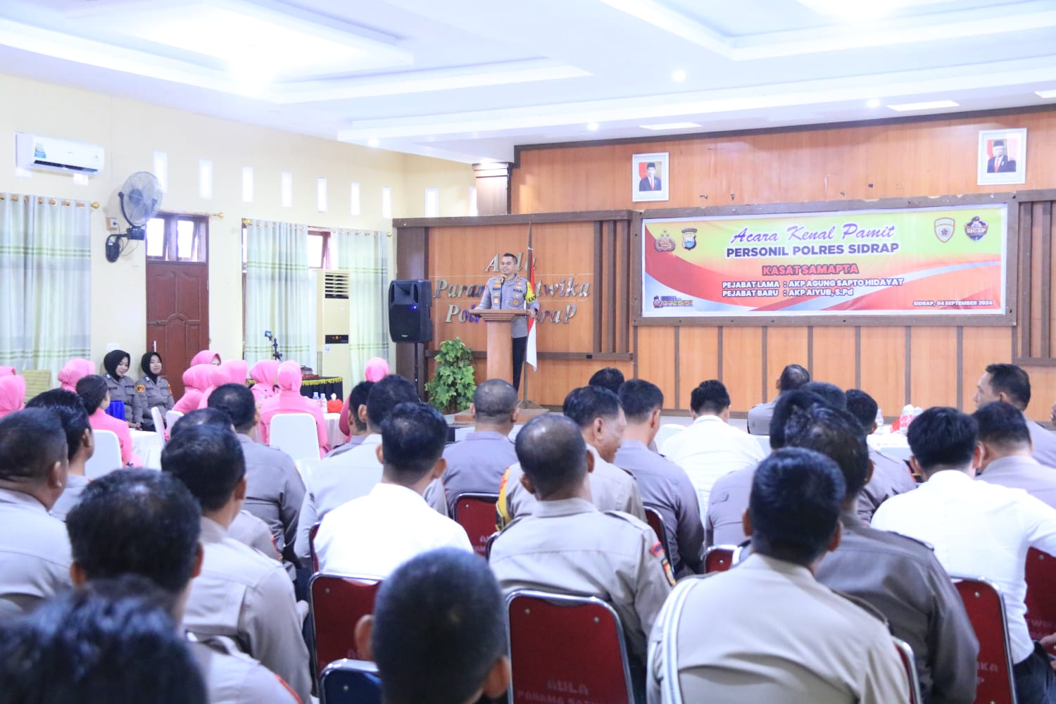 Kapolres Sidrap, AKBP Dr. Fantry Taherong, dalam sambutannya menyampaikan apresiasi yang tinggi kepada AKP Agung Sapto Hidayat atas dedikasi dan kontribusinya selama bertugas di Polres Sidrap. “Beliau telah menjalankan tugas dengan sangat baik, khususnya dalam menjaga keamanan dan ketertiban di wilayah Sidrap,” ujar Kapolres.