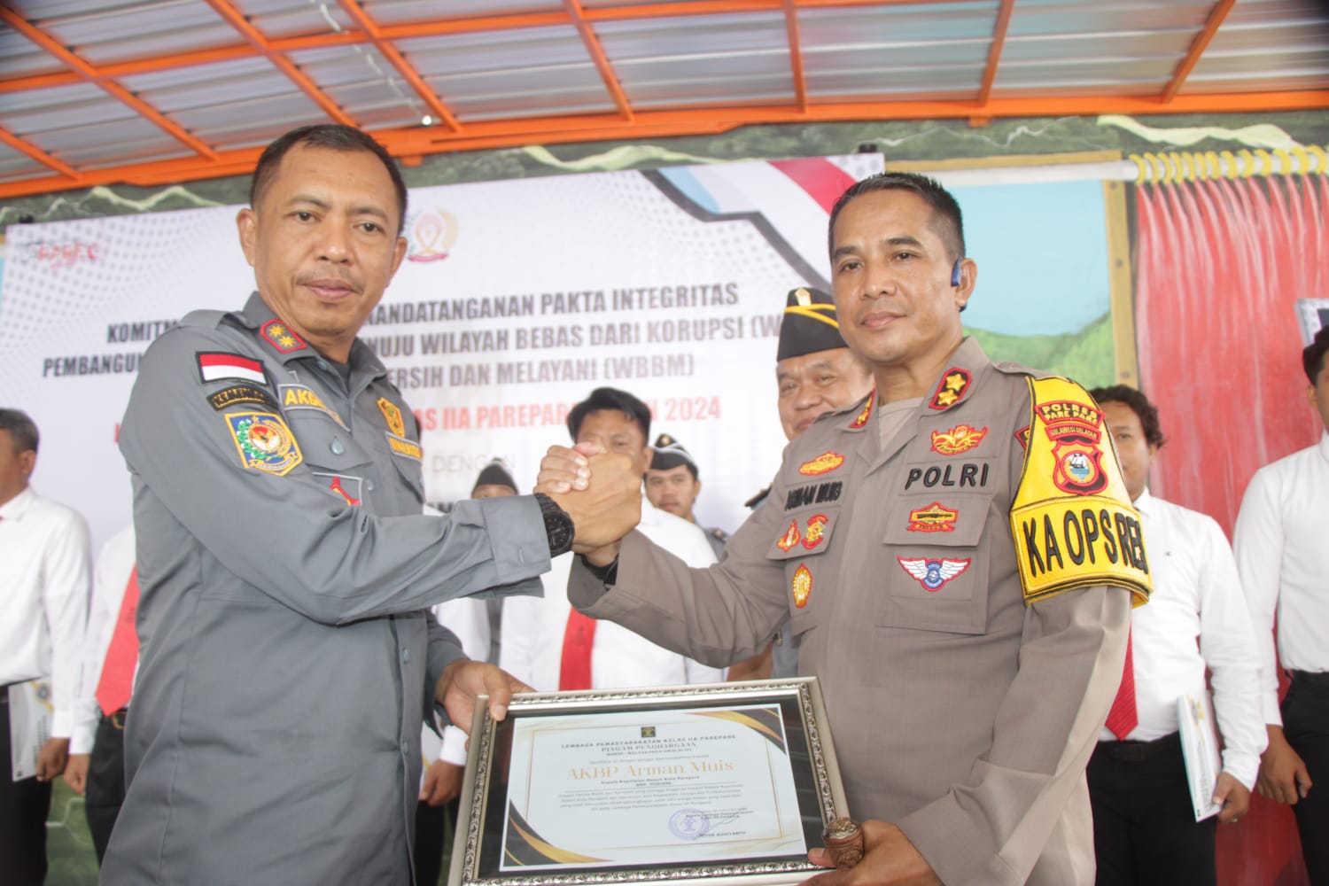 Pemberian Penghargaan atas keberhasilan jajaran Polres Parepare merupakan rangkaian dari kegiatan Komitmen Bersama Membangun Zona Integritas dan Penandatanganan Fakta Integritas yang berlansung di Lembaga Pemasyarakatan Kelas II A Parepare yang terletak di Jl. Jend. M. Yusuf Kel. Galung Maloang Kec. Bacukiki, Kota Parepare.
