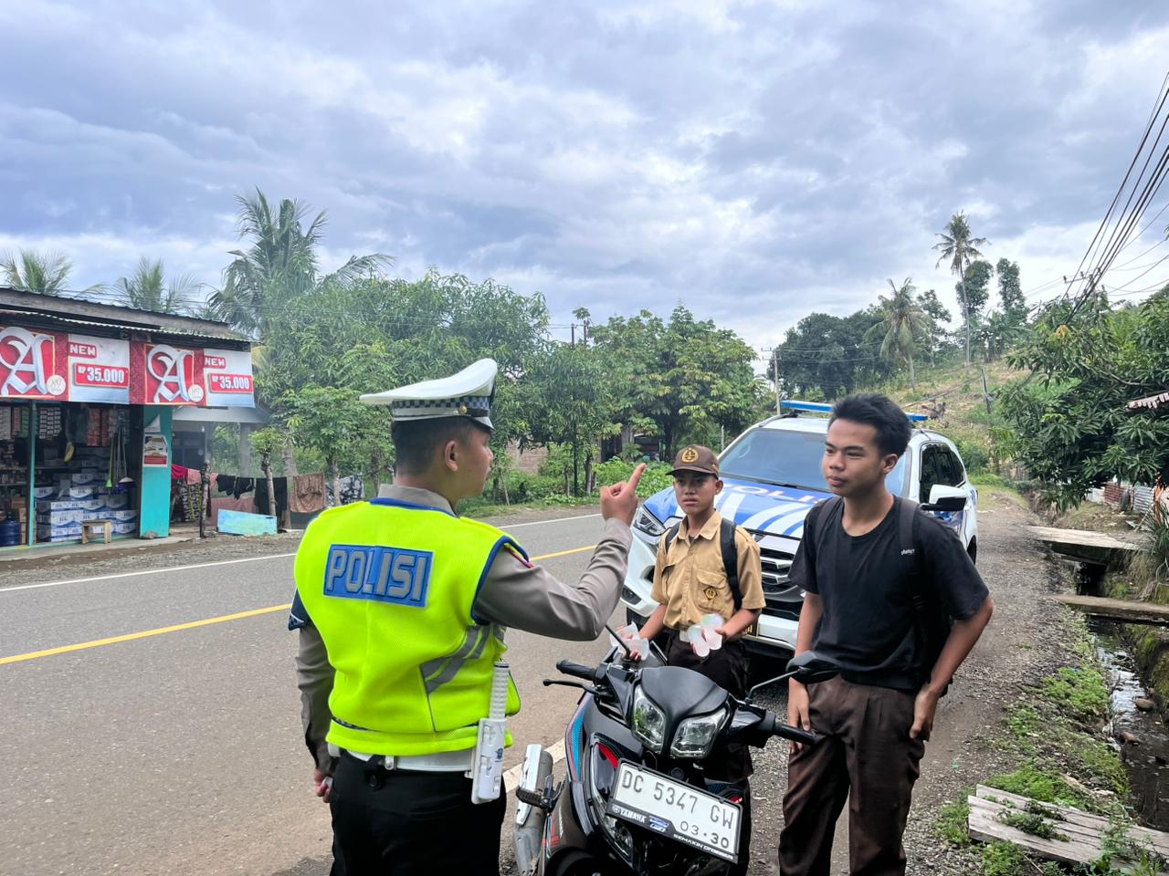 Selain itu, petugas juga memberikan teguran edukatif kepada beberapa pelajar yang menggunakan kendaraan roda dua namun belum mematuhi peraturan keselamatan dengan tidak menggunakan helm.
