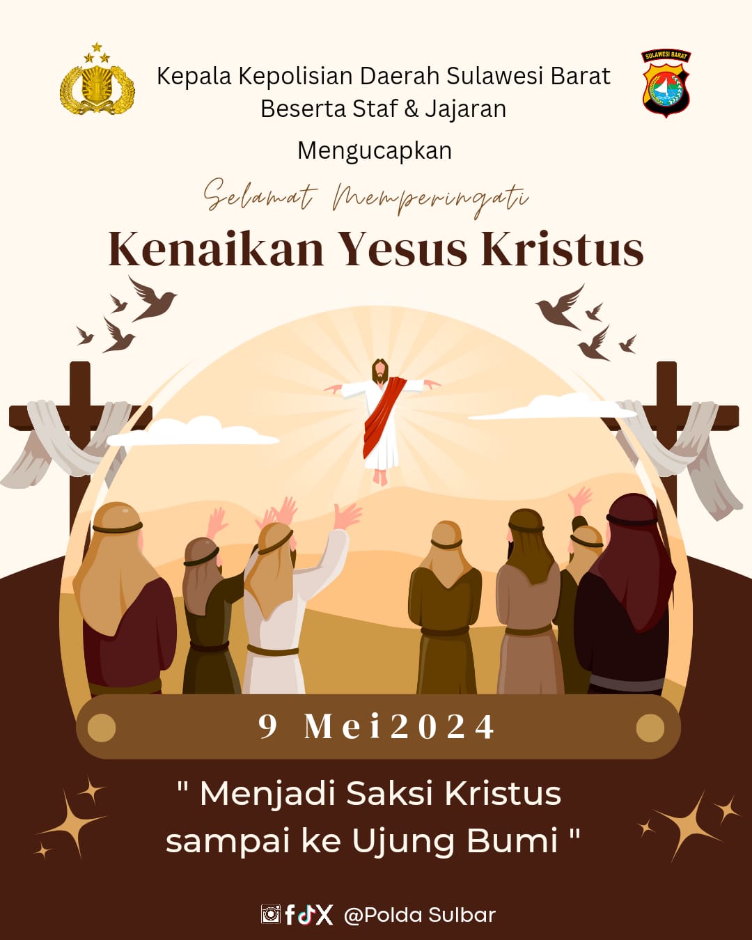 Polda Sulbar – Kepolisian Daerah Sulawesi Barat turut mengucapkan selamat memperingati hari Kenaikan Isa Almasih bagi seluruh masyarakat Indonesia khususnya di Sulbar yang beragama Kristiani, Kamis (9/5/24).
