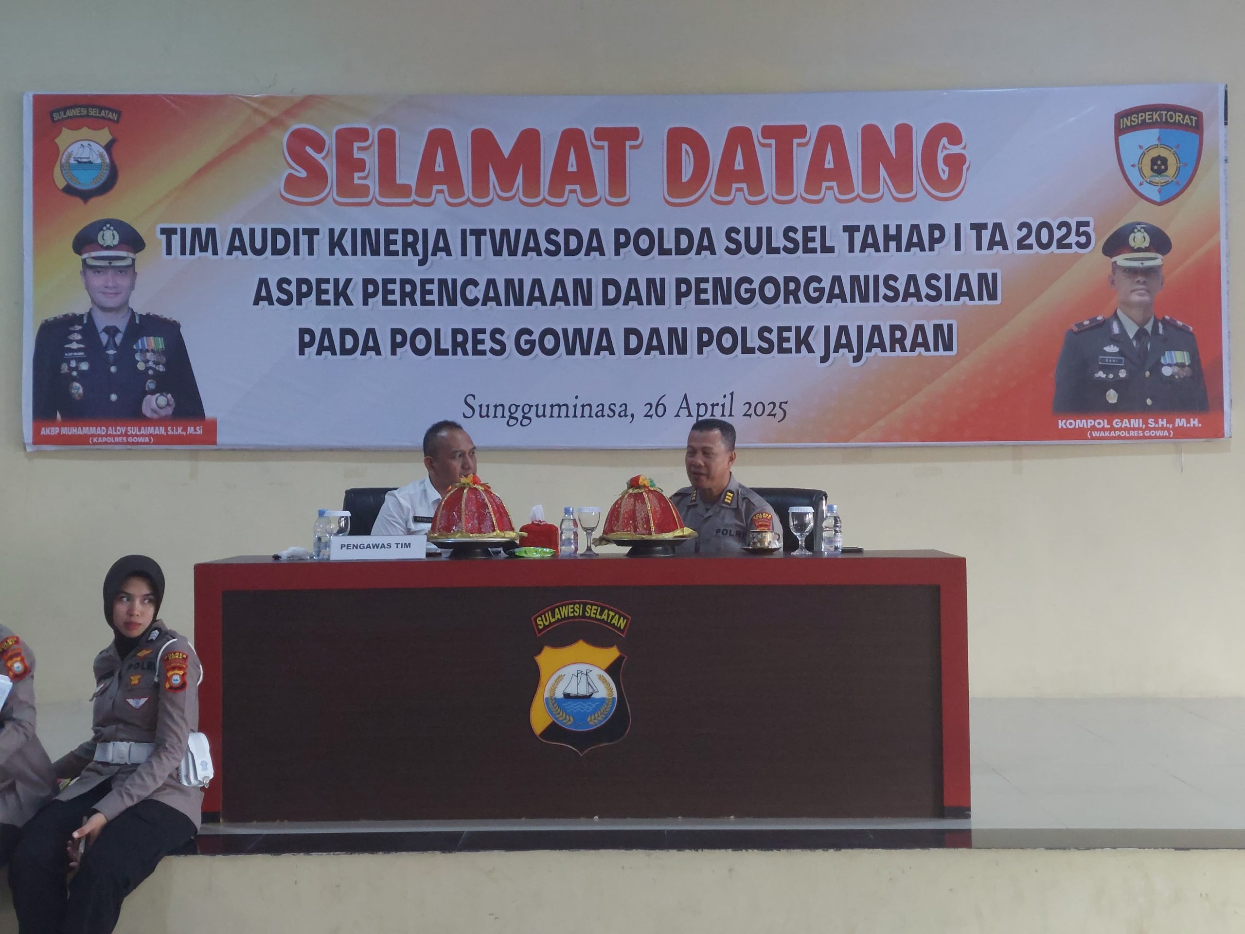 Polres Gowa menerima kunjungan Tim Audit Kinerja Itwasda Polda Sulsel Tahap I T.A. 2025 dengan fokus pada aspek perencanaan dan pengorganisasian di lingkungan Polres Gowa dan Polsek jajaran, Sabtu (26/4/2025).